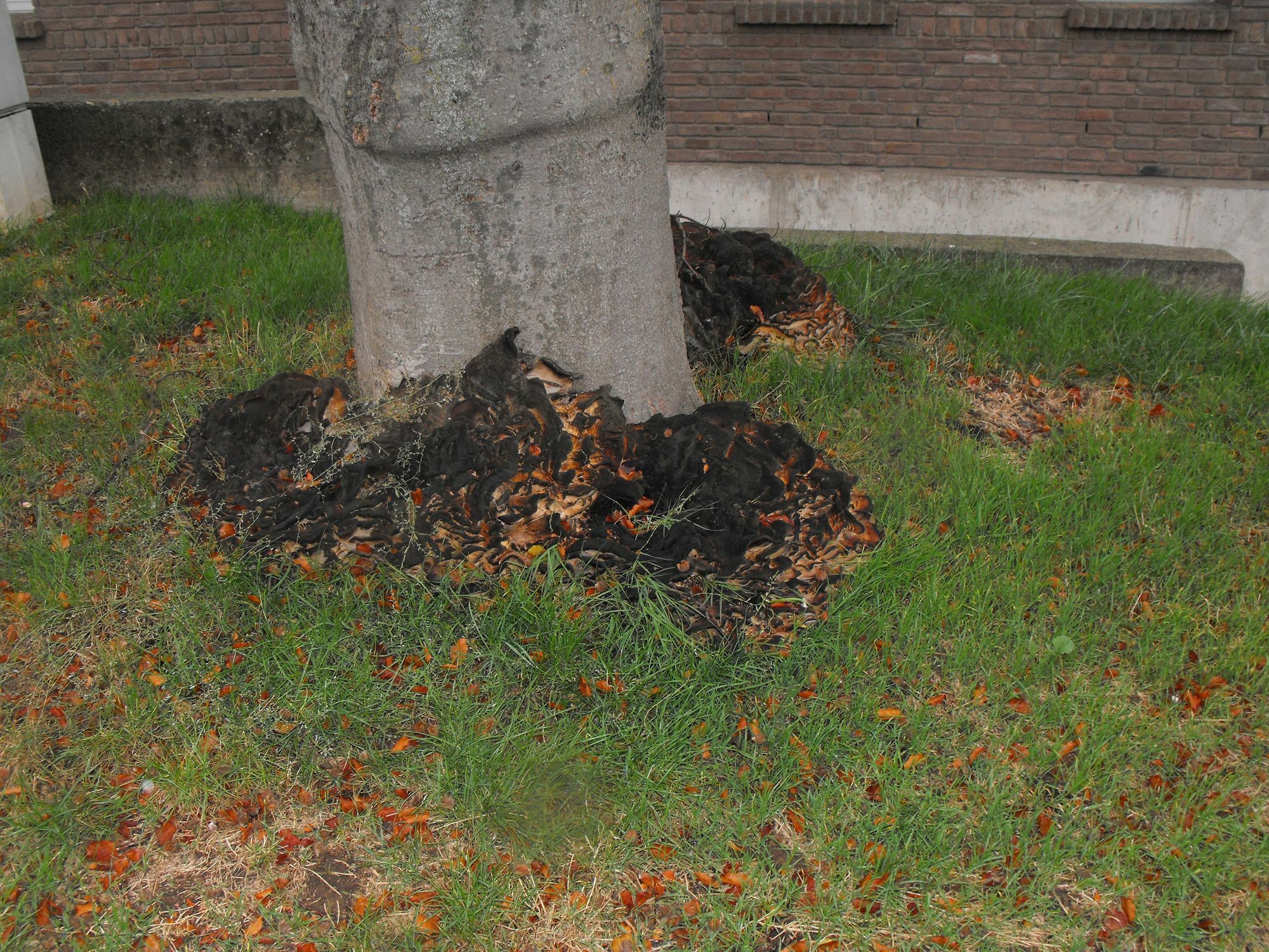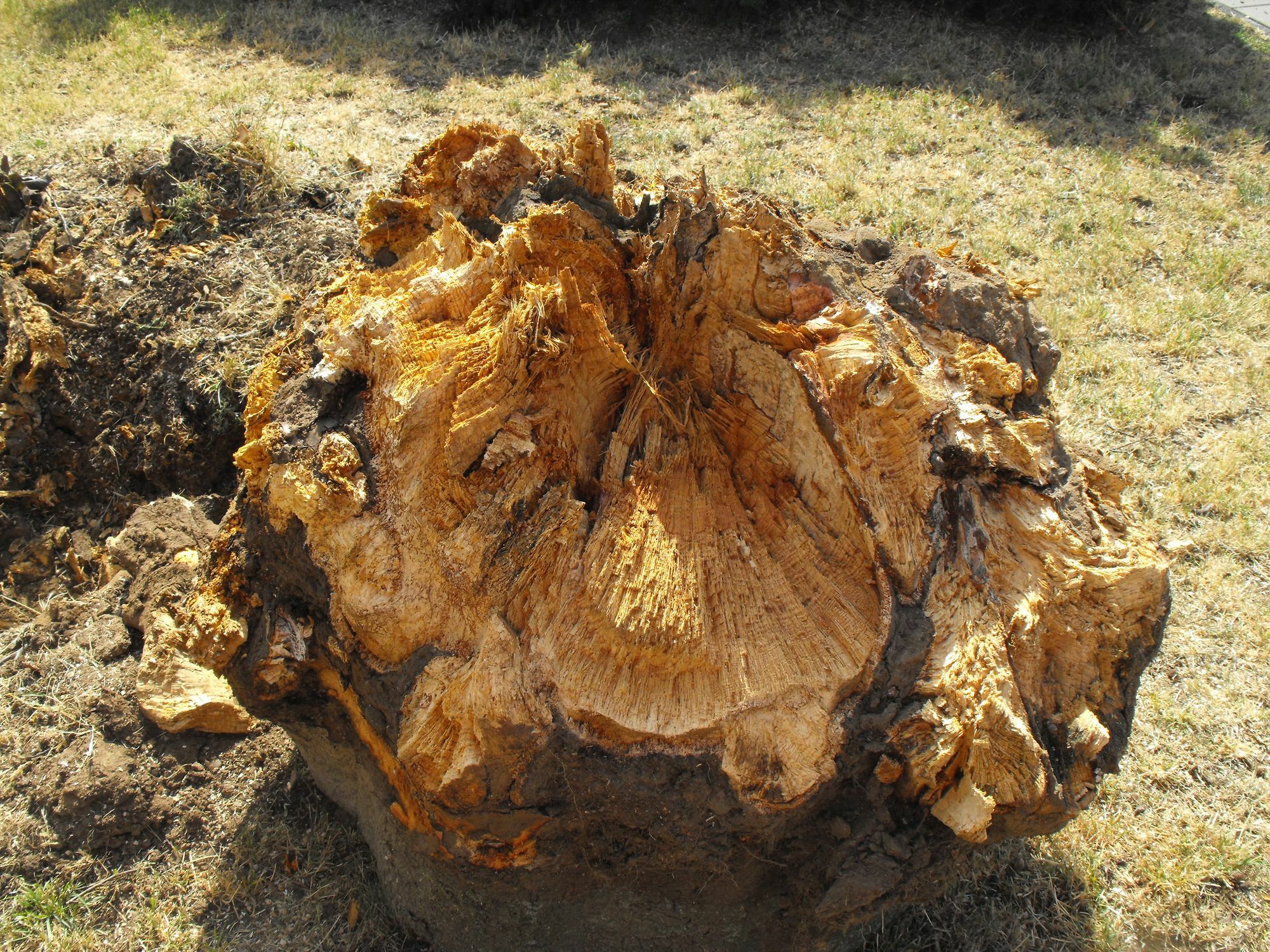 Im Dezember 2018 wurde die Schädigung des Baumes durch den Riesenporling im Wurzelbereich festgestellt. Der Riesenporling ist ein holzzersetzender Pilz. Der Befall hat zu einer fortgeschrittenen Fäule an den Hauptwurzeln mit Versprödung geführt. Dies hat die Standsicherheit des Baumes so sehr beeinträchtigt, dass eine Fällung des Baumes auf Grund der Verkehrssicherungspflicht unumgänglich war. Die aufgebauten Hilfswurzen konnten die dauerhafte Standfestigkeit nicht übernehmen. Nach Absetzung der Krone konnte der Reststamm ohne Wiederstand mit einem Fällbagger senkrecht ausgehoben werden.