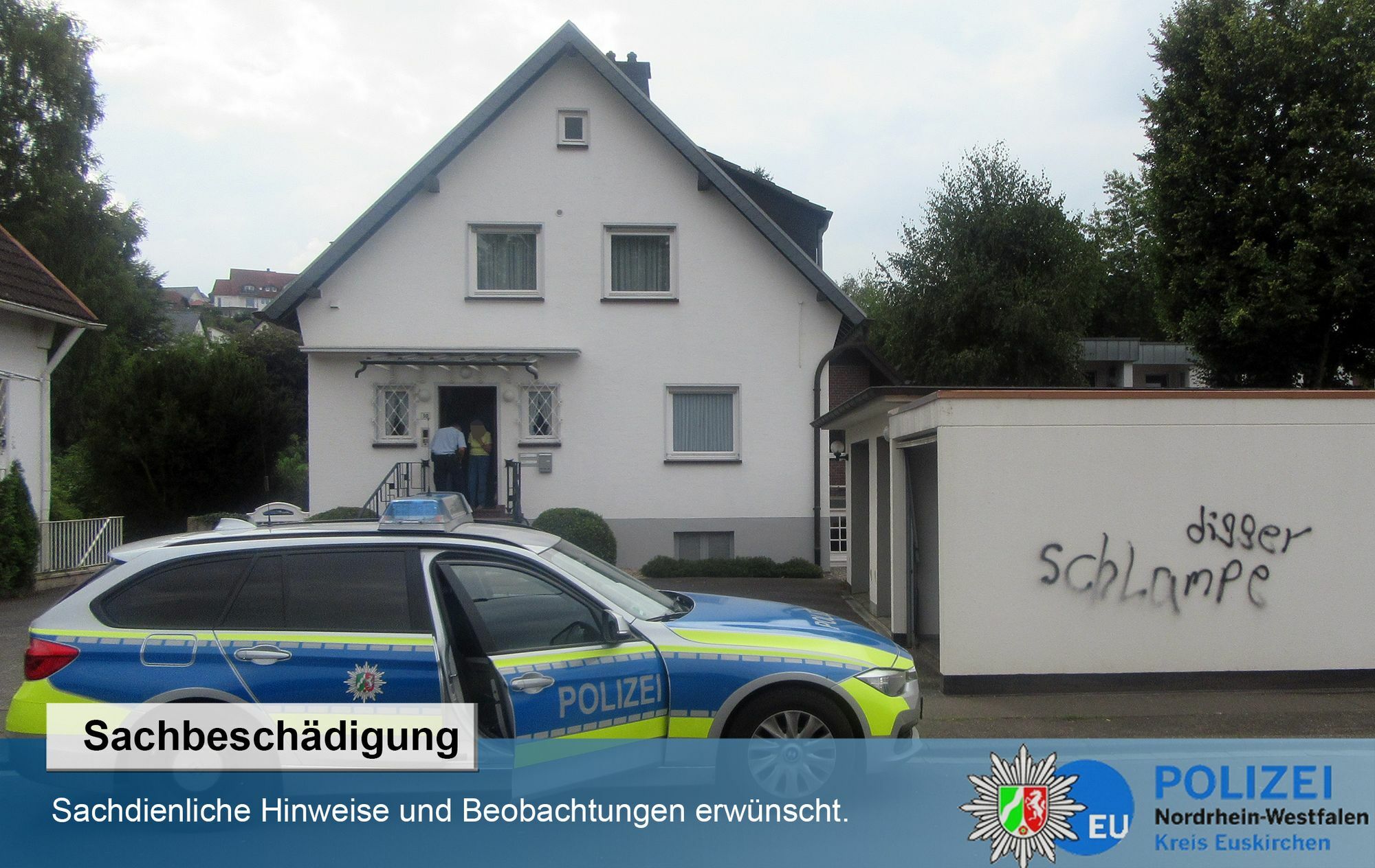 Wieder muss die Polizei in Kall tätig werden. Dieses Mal sucht sie unbekannte Täter, die mit schwarzem Sprühlack drei Wohnhäuser und die Grundschule in der Auelstraße mit beleidigenden Worten verunzierten.
