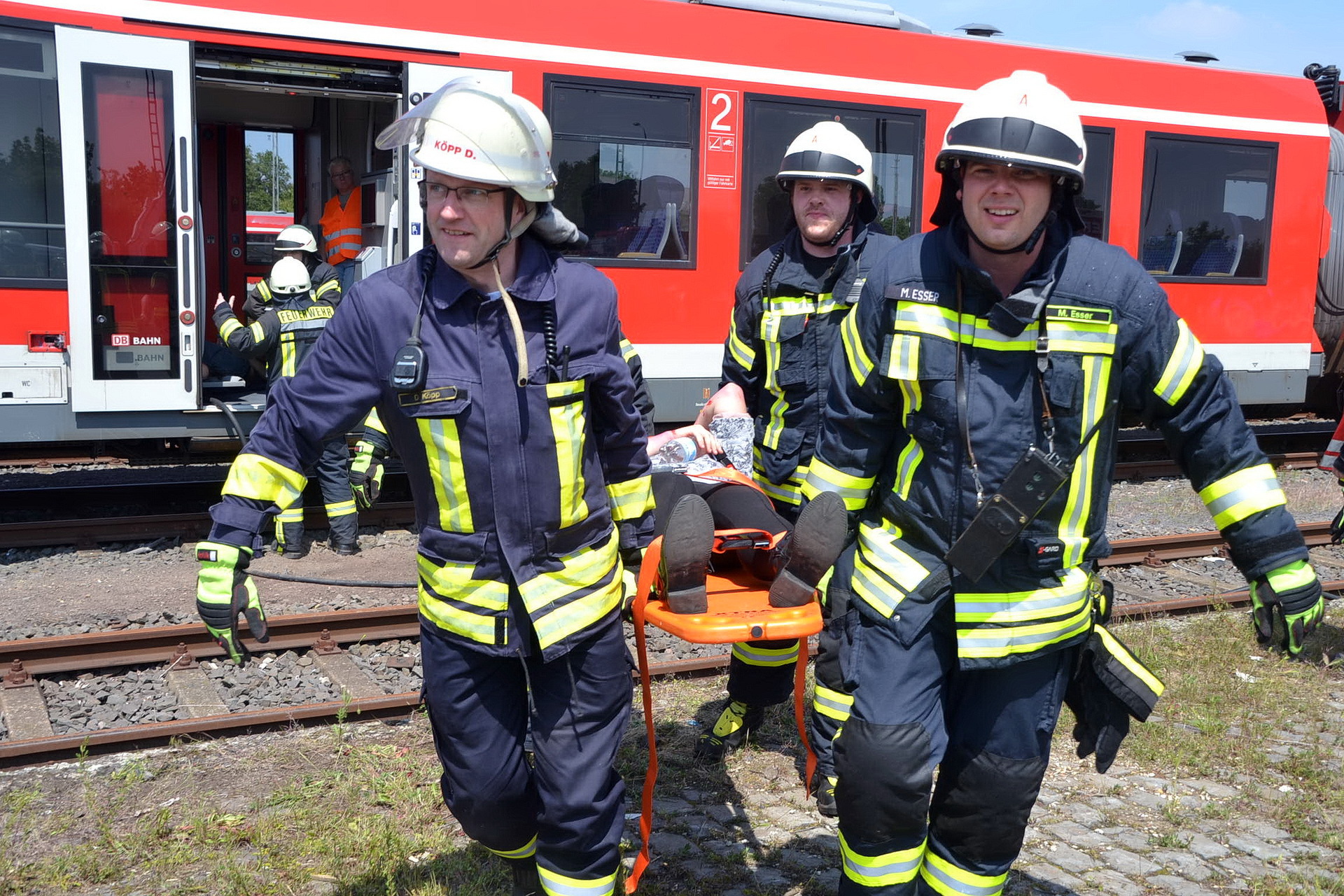 „Die Tatsache, dass das Szenario nur gestellt ist, rückt daher schnell in den Hintergrund und jeder konzentriert sich auf seine Arbeit“, berichtete der Kreisbereitschaftsleiter des Roten Kreuzes. Und davon gab es am Güterbahnhof mehr als ausreichend. Vor der Versorgung der „Patienten“ mussten diese nämlich zunächst aus dem Zug geholt werden, dessen Türelektronik ausgefallen war.