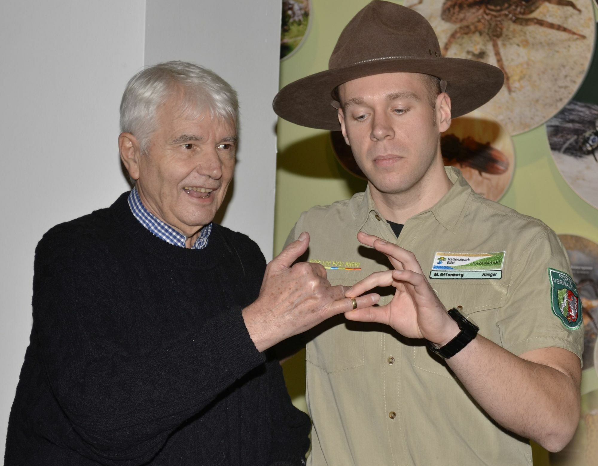 Diesen Ring hatte der Nationalpark-Ranger Max Effenberg vor dem Start seiner Rangertour durch den barrierefreien Naturerlebnisraum Wilder Kermeter am 22. Januar mit eingraviertem Namen im Schnee gefunden. Nachdem die Nationalparkverwaltung ein Foto des Rings bei Facebook gepostet hatte, suchte das ganze Netz nach dem Besitzer. Diese große Resonanz in den Sozialen Medien bliebt natürlich auch den Zeitungen, Rundfunk-und Fernsehanstalten nicht verborgen, die im gesamten Bundesgebiet über die Suchaktion berichteten. Entsprechend war denn auch der Medienrummel, als Karl-Heinz in der Ausstellung »Wildnis(t)räume« im Nationalpark-Zentrum Eifel auf Vogelsang seinen Ehering zurück erhielt. Den Ranger Max Effenberg lud der Rentner aus Dankbarkeit zum Sightseeing in seine Heimatstadt Duisburg ein.
