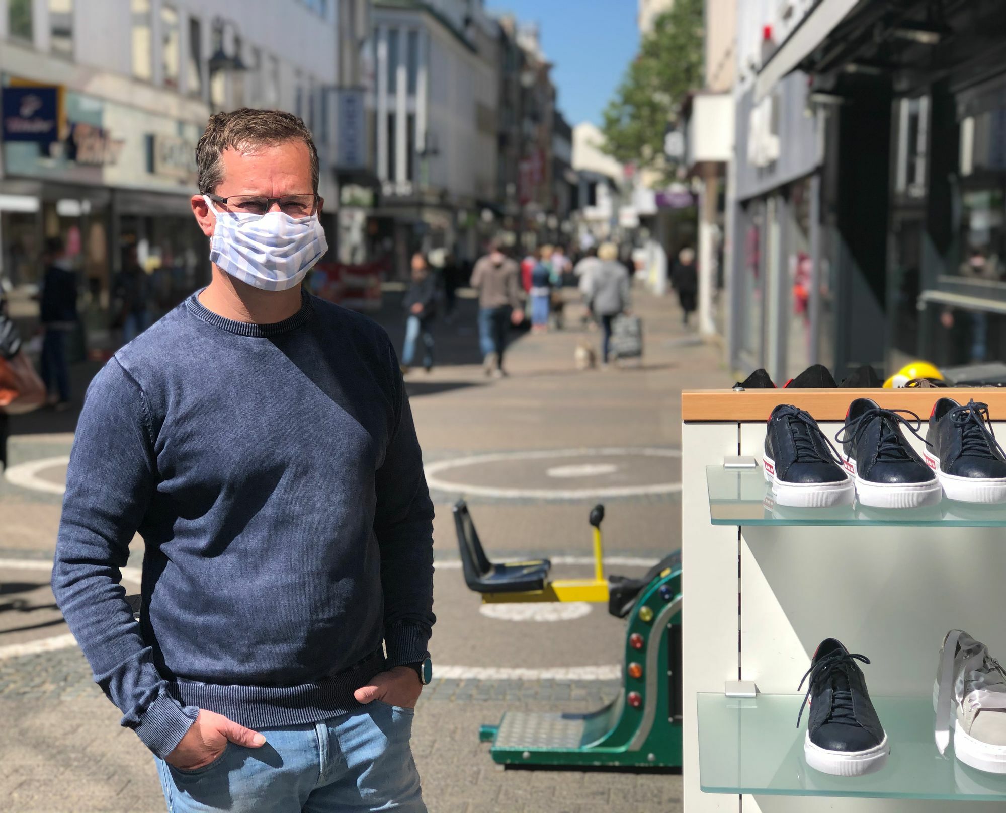 Auch Schuhfachhändler Christian Lange hat seit Montag seine Geschäfte in der Euskirchener Innenstadt wieder geöffnet. »Das Geschäft läuft wieder an«, sagt Lange. Gefragt seien derzeit vor allem Kinderschuhe, aber auch ältere Kunden seien an den ersten Tagen nach Lockerung der Corona-Maßnahmen in das Schuhgeschäft gekommen.