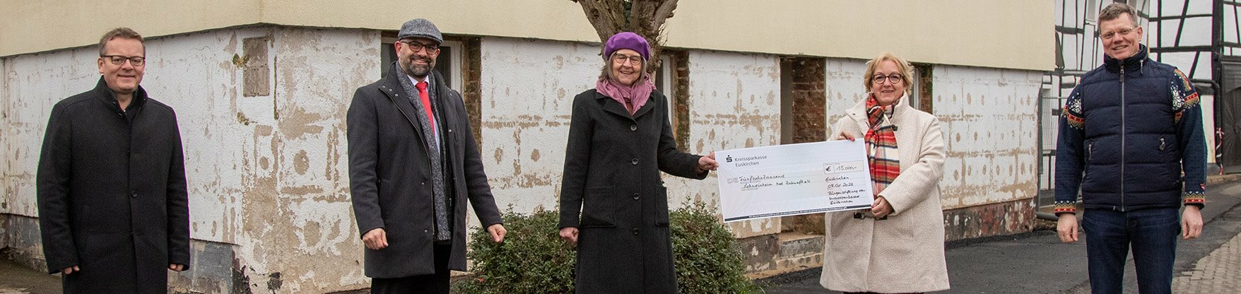 Um mehr über die Tätigkeiten von »Schweinheim hat Zukunft« zu erfahren, haben sich kürzlich Rainer Santema, Verhinderungsvertreter des Vorstandes der Kreissparkasse, und Clas Kohlheyer als Vertreter der KSK-Bürgerstiftung mit Beate Klinke, Astrid Hartung und Karl Kreuzberg, dem Vorstand des Schweinheimer Vereins, am Bürgerhaus des Ortsteils getroffen. Santema ist selbst in Schweinheim aufgewachsen und kennt die Lage dort sehr gut. »Ich weiß, wie lange die Menschen hier noch mit den Folgen der Katastrophe beschäftigt sein werden und freue mich daher sehr, dass wir durch die Mittel der Bürgerstiftung eine große Summe übergeben können.«