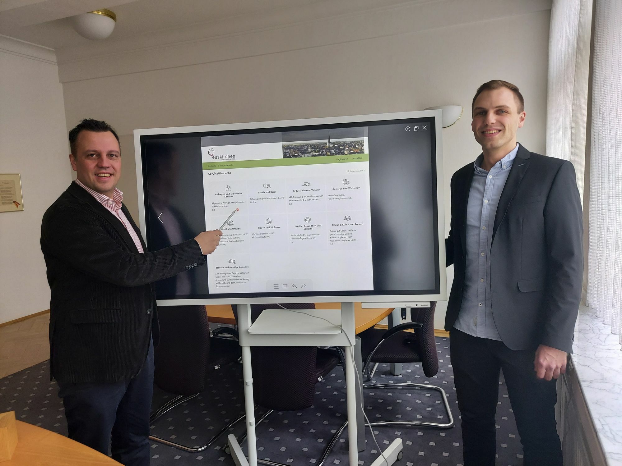 Die angebotenen Serviceangebote können den Kontakt zwischen Bürger und Verwaltung in vielen Fällen deutlich vereinfachen und Wege ins Rathaus gegebenenfalls ersetzen. Das Portal enthält Formulare für verschiedene Dienstleistungen der Stadtverwaltung, wie beispielsweise. Hundesteueranmeldung, Kontakt zur Rentenstelle oder Wohnungsaufsicht, welche schnell und unkompliziert online ausgefüllt und an die zuständigen Ansprechpartner übersandt werden können. Dabei sind das Portal sowie die Anträge so gestaltet, dass ein Ausfüllen bequem auf jedem Endgerät – egal ob Computer, Tablet oder Smartphone – möglich ist. Zudem stehen auch Verlinkungen auf die Angebote anderer Behörden, die für die Bürgerinnen und Bürger der Kreisstadt Euskirchen von Interesse sein können, zur Verfügung. „Die Dienstleistungen im Portal werden in den kommenden Monaten und Jahren stetig erweitert, sodass mittelfristig eine einfache und unkomplizierte Möglichkeit zur Abwicklung fast jedes Anliegens möglich sein soll.“ so Bürgermeister Sacha Reichelt, der sich den aktuellen Stand des Portals von Bastian Eich, E-Government-Beauftragter der Stadt, vorstellen ließ und es für die Startseite freigab. „Das Service-Portal ist ein Baustein zu einer digitaleren Verwaltung mit flexiblem Service rund um die Uhr. Das Online-Serviceportal ist unter www.euskirchen.de direkt auf der Startseite unter „Stadtkontakt“ zu finden. Der direkte Link lautet https://portal.kommunale.it/euskirchen/.