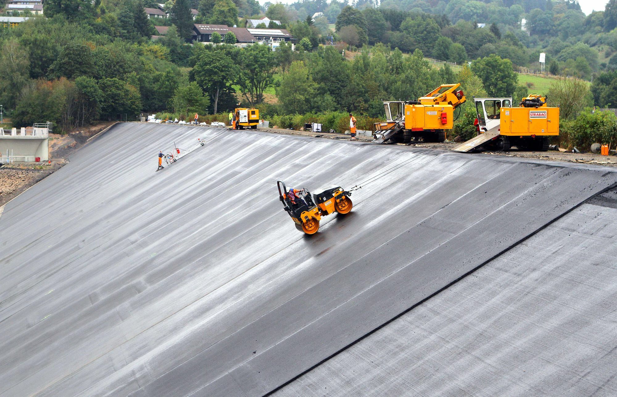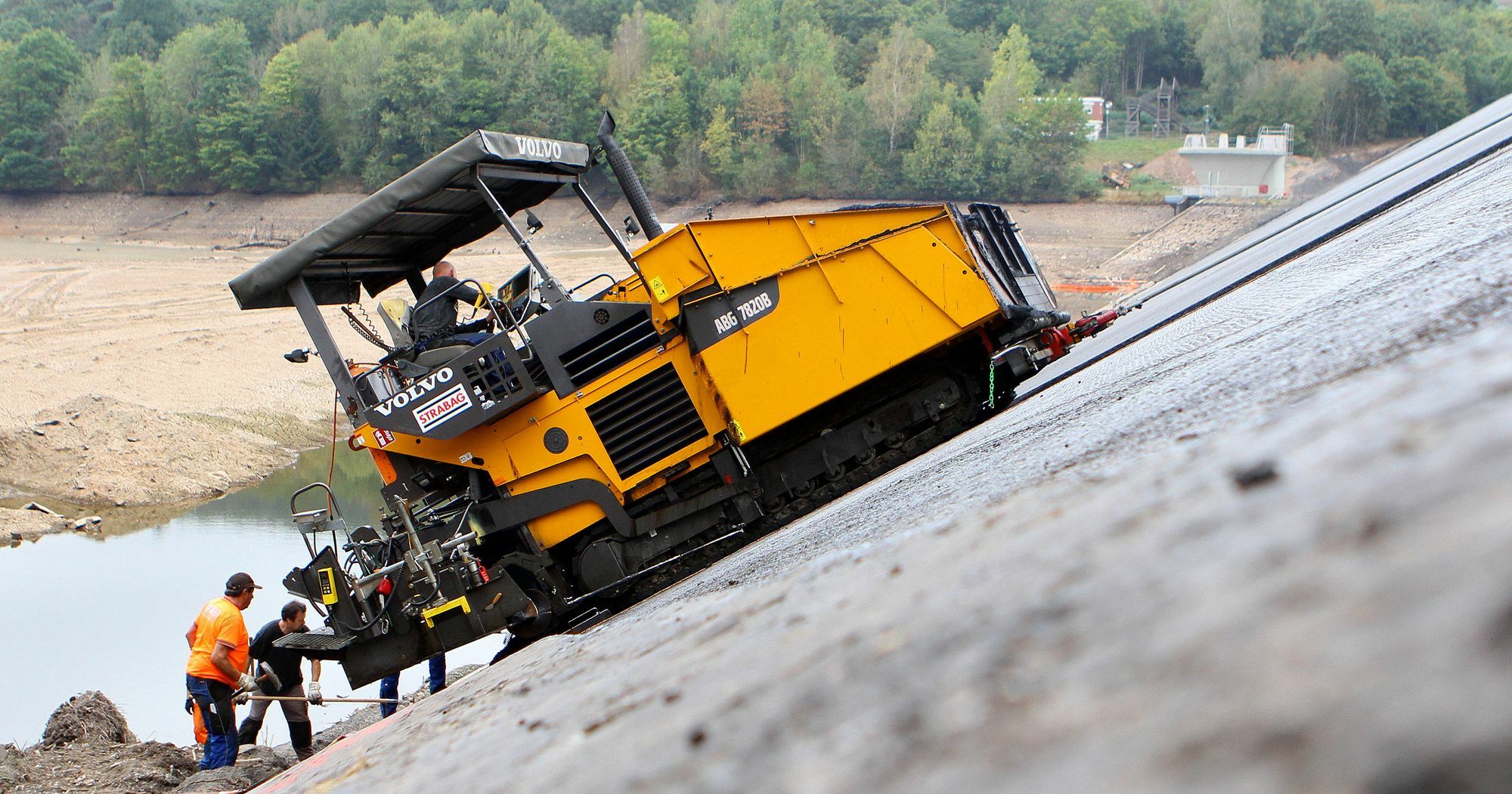 Es ist wohl die spektakulärste Baustelle die es im Augenblick im Kreis Euskirchen gibt. Mit schwerem Spezialgerät wird die Stauanlage des Kronenburger Sees auf der Länge von rund 325 Metern und einer um 27 Grad geneigten Fläche von der Firma Strabag mit einer neuen Asphaltdecke versehen.