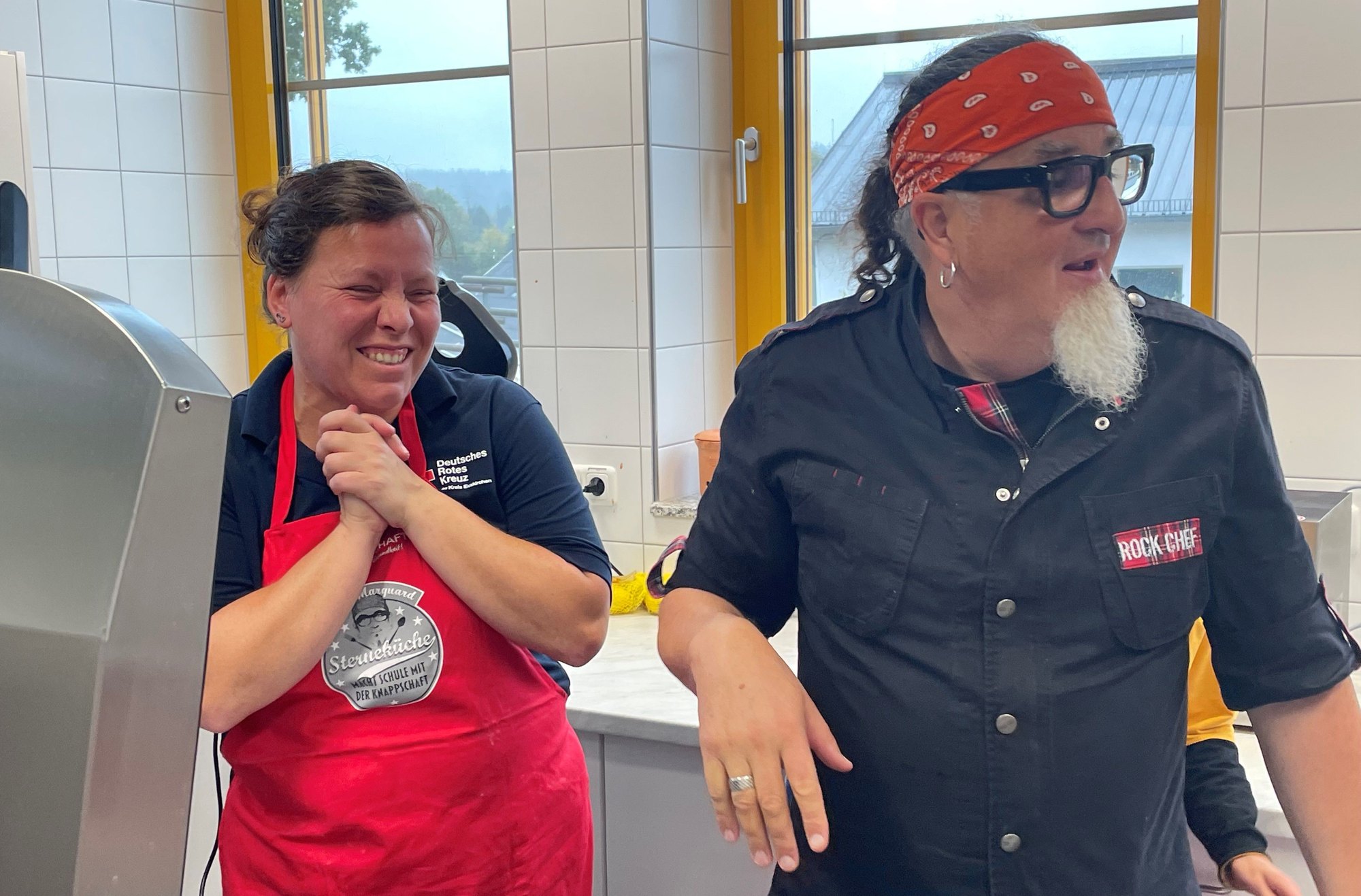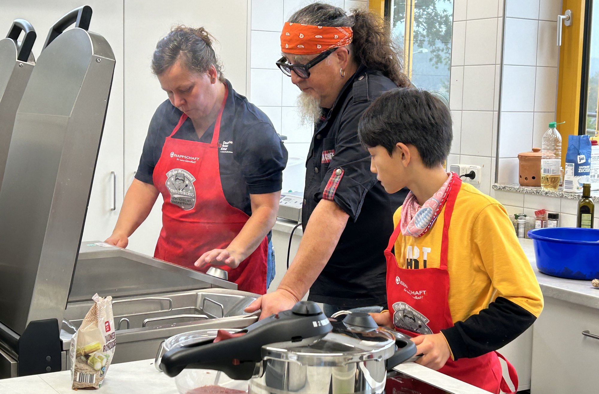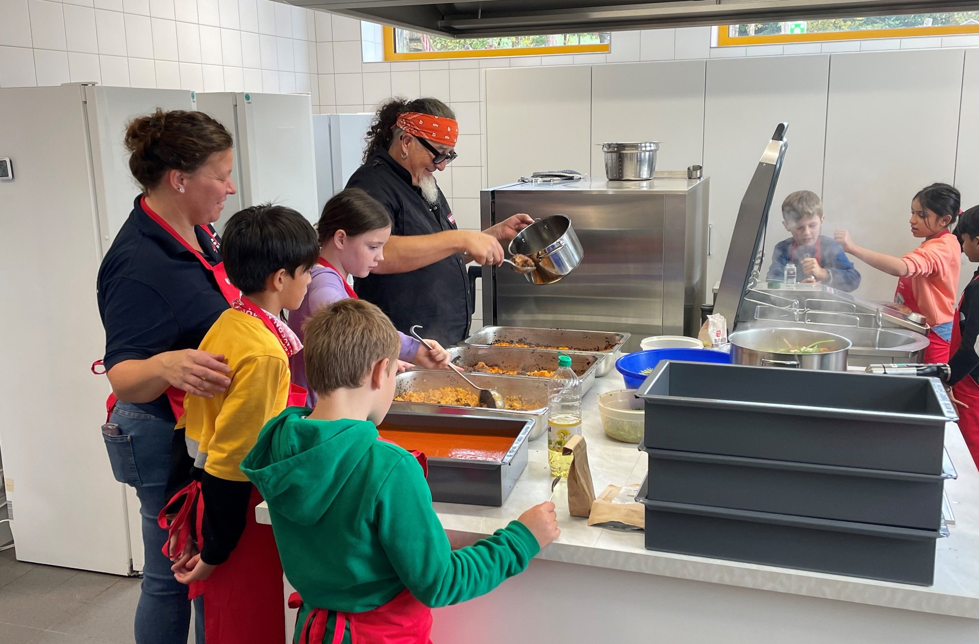Auch in Dahlem gelang es Stefan Marquard gelang es schnell, die Kinder, aber auch das OGS-Team des DRK, die interessierten Lehrerinnen und natürlich auch die Schulköchin mit seinem Wissen und Kochkünsten zu begeistern. Das gemeinsame Mittagessen in der Mensa und die Urkunden bildeten einen schönen Abschluss eines außergewöhnlichen und tollen Küchentages.