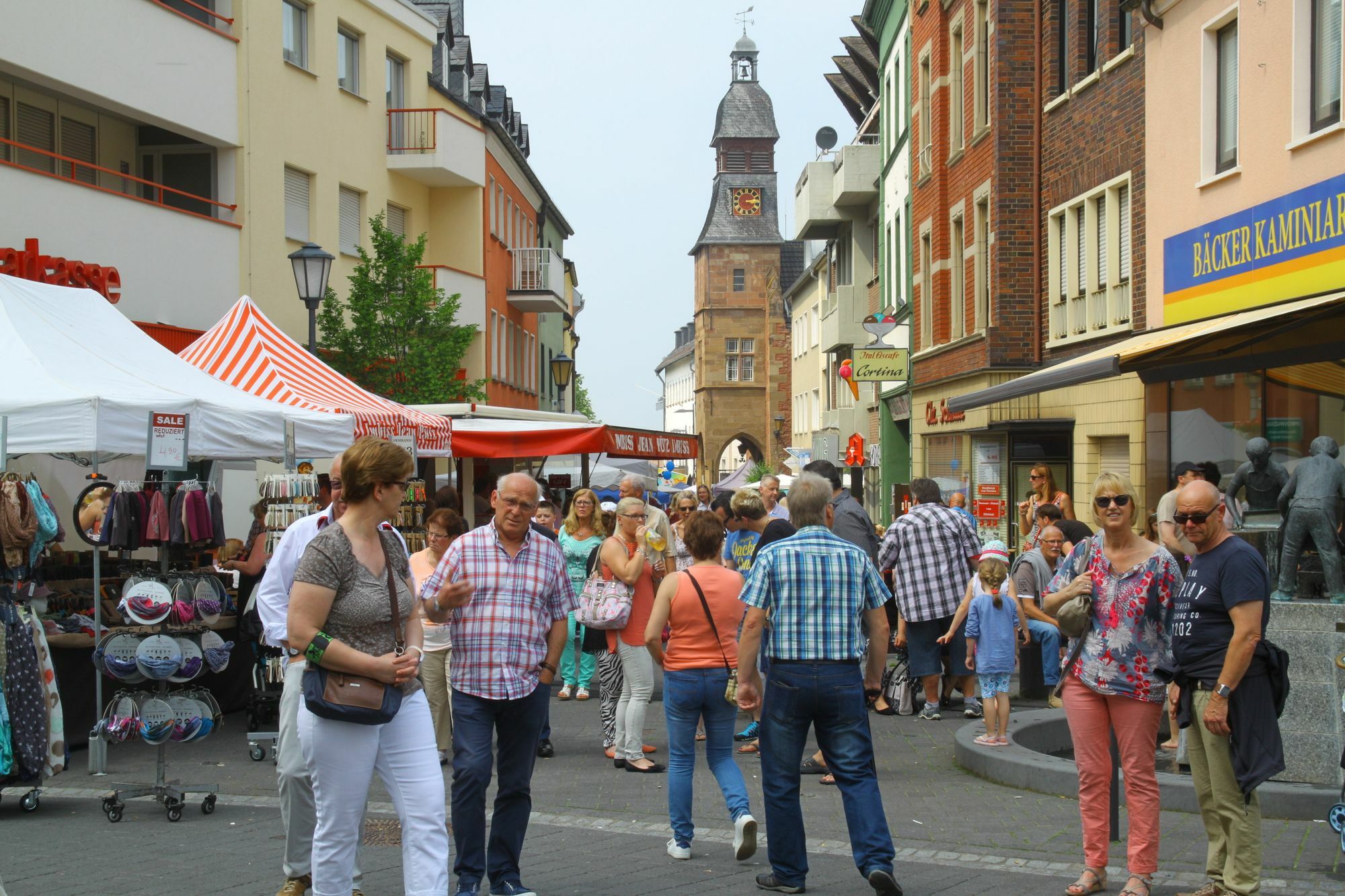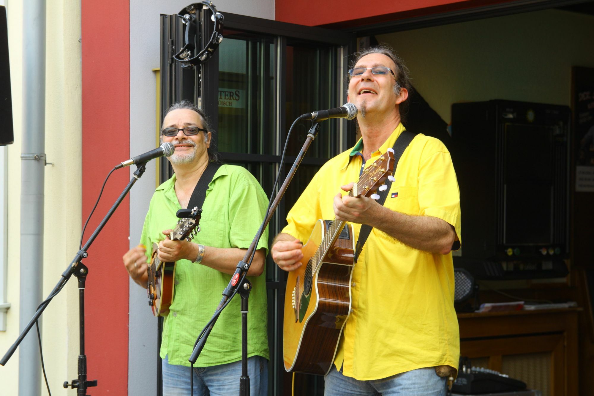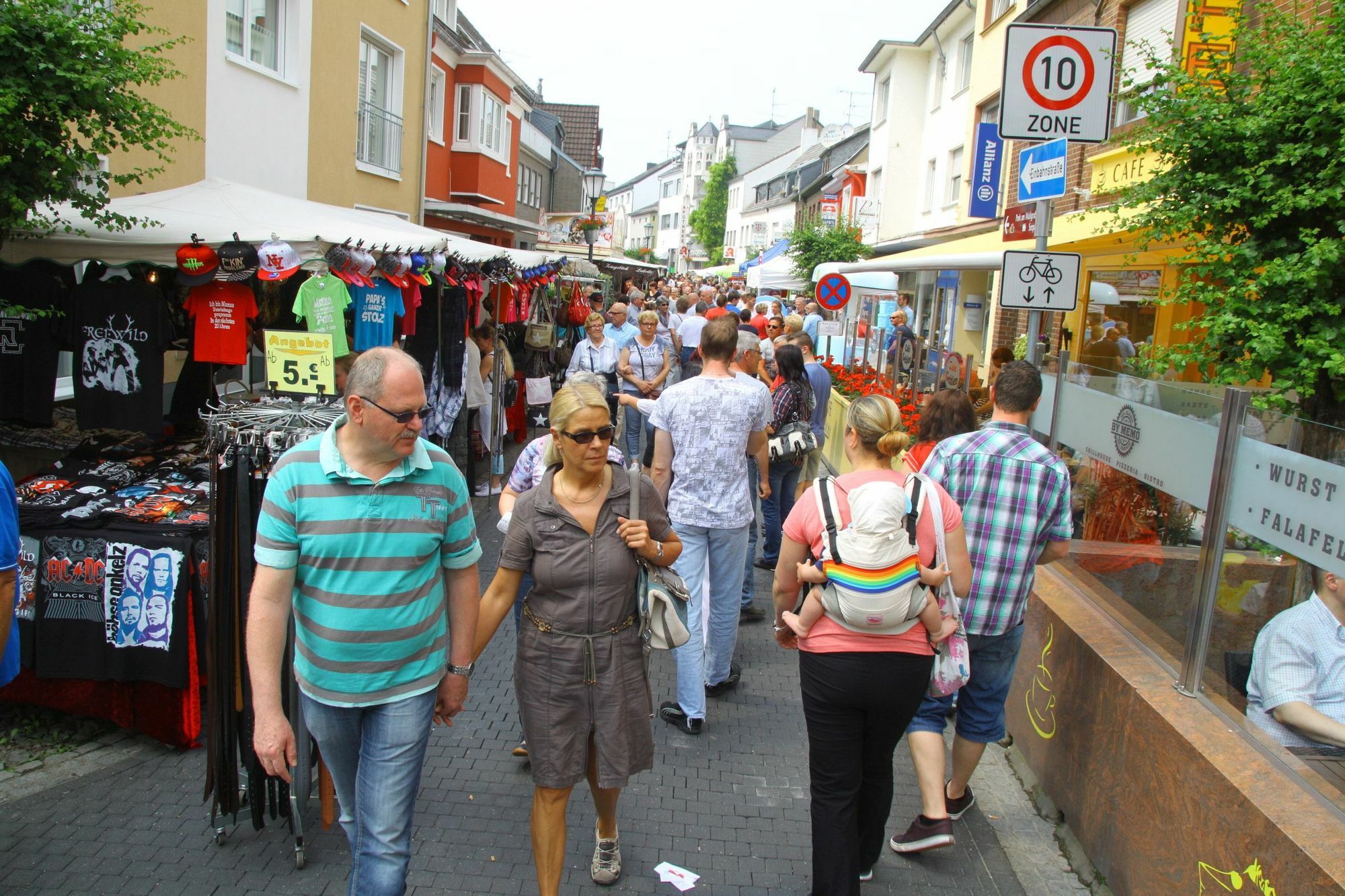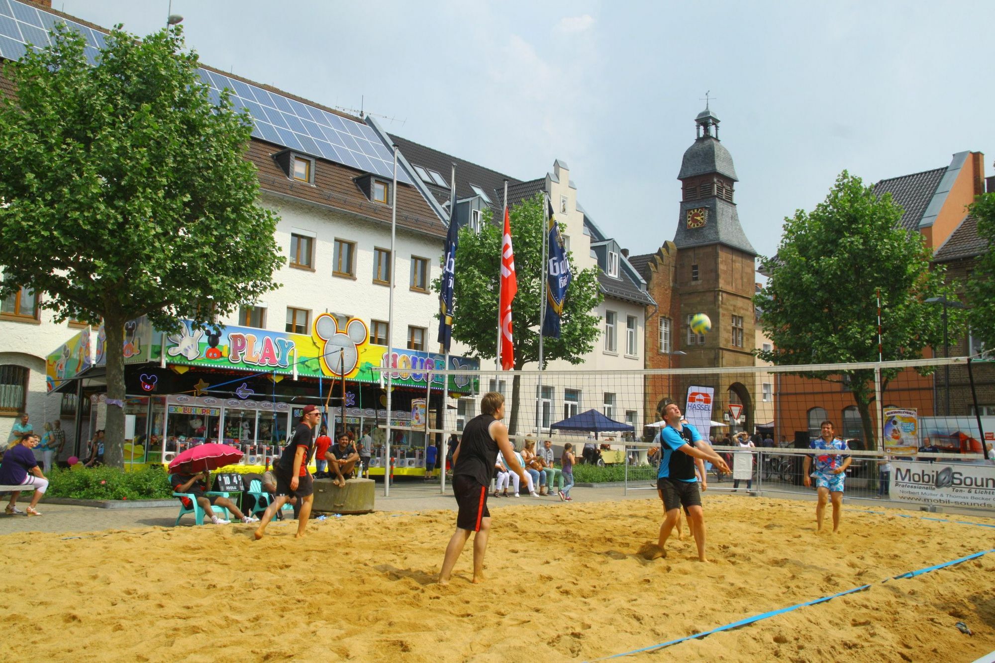 Ob an den Trödelständen, an denen alte Schallplatten, Brettspiele und ähnliches feilgeboten wurden, oder in den Geschäften, die für den 43. Zülpicher Straßenmarkt samstags länger und auch am Sonntag geöffnet hatten – für jeden war das Richtige dabei. „Es war für alle Beteiligten ein Erfolg“, sagte René Bohsem, der Vorsitzende von der Aktionsgemeinschaft Zülpich Fachgeschäfte Aktiv. In manchen Läden sei es fast sogar zu voll gewesen. Wie viele Besucher genau ihren Weg nach Zülpich gefunden hatten, konnte Bohsem nur schätzen. „Es werden mehrere Tausend gewesen sein“, so der Vereinsvorsitzende. Der Resonanz nach zu urteilen habe man einen neuen Besucherrekord geknackt. Auf dem Marktplatz gab es dabei ein besonderes Highlight zu erleben. Dort hatten die Organisatoren von der Aktionsgemeinschaft gemeinsam mit dem TuS Zülpich ein Beachvolleyball-Feld aufgebaut – und dafür eigens den Sand auf dem Marktplatz angehäuft. Im Sonnenschein am Sonntag kamen die Sportler dann ganz schön ins Schwitzen – für die Zuschauer kam indes richtiges Sommerfeeling auf. Der Vorstand der Aktionsgemeinschaft spielte dabei zwei Partien gegen Flüchtlinge aus Zülpich und Umgebung. „Wir haben beide Sätze knapp verloren“, schmunzelte Bohsem. Aber Spaß habe die Aktion trotzdem gemacht. Nach Ende des Straßenmarktes wurde der Sand an die Zülpicher verschenkt. Wer sich nicht für Volleyball begeistern konnte, durfte am Münstertor bei Sport Fröhling seine Fußballkünste testen und auf die Torwand schießen. Für Hungrige bot die Prinzengarde dazu leckere Reibekuchen an. Am Kölntor hingegen sorgten die Blauen Funken für das Programm – sie boten am Samstagabend ein Konzert an. Auf dem Fest wurde aber nicht abends musikalisch etwas geboten. „Op d’r Kinat“ spielten über beide Tage mehrere Newcomerbands, die das Fest beschallten. Am Samstag war die Band Rottland für die Musik zuständig, am Sonntag spielten Bottleneck und das Duo Guitar (TN). Fotos: Nolden