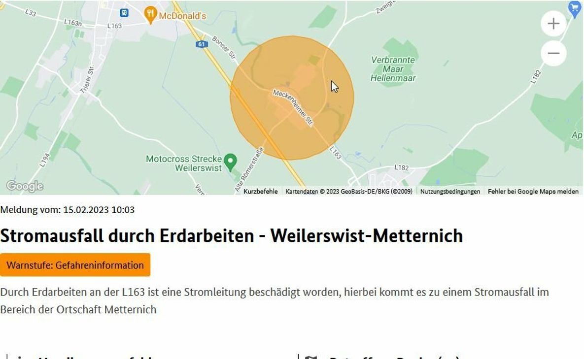 Falls möglich, informieren Sie sich in den Medien, zum Beispiel im Lokalradio. Wählen Sie nur in Notfällen den Notruf 110 (Polizei) und 112 (Feuerwehr). Die Störung wird so schnell wie möglich behoben. Das Feuerwehrgerätehaus Weilerswist-Metternich ist als Notfallmeldestelle durch die Feuerwehr besetzt.