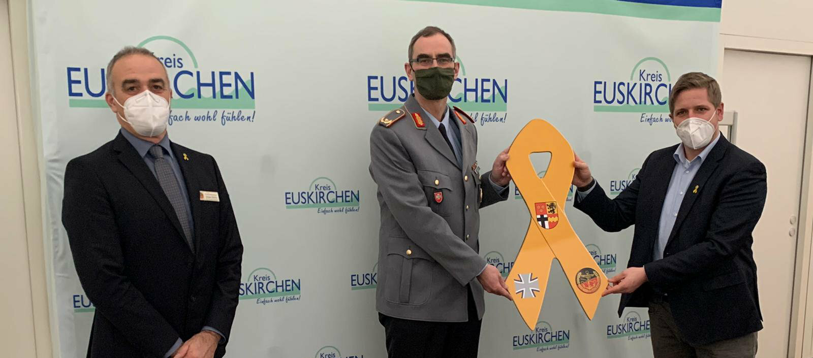 Und so freute er sich auch über ein ganz besonderes Geschenk, das ihm Oberstabsfeldwebel a.D. Jürgen Görlich jetzt überreichte: die „Gelbe Schleife der Solidarität“. Görlich ist stellvertretender Bundesvorsitzender des Deutschen Bundeswehrverbandes, und gemeinsam mit Brigadegeneral Peter Webert, dem Standortältesten von Euskirchen, war er kürzlich im Kreishaus zu Gast. Die „Gelbe Schleife“ gelte in Deutschland seit einigen Jahren als Inbegriff der Solidarität und politisch unabhängiges Zeichen der Verbundenheit mit den Menschen in der Bundeswehr, so Görlich. Ramers dankte und versprach, dass die Schleife einen für alle sichtbaren Platz im Kreishaus erhalten werde.