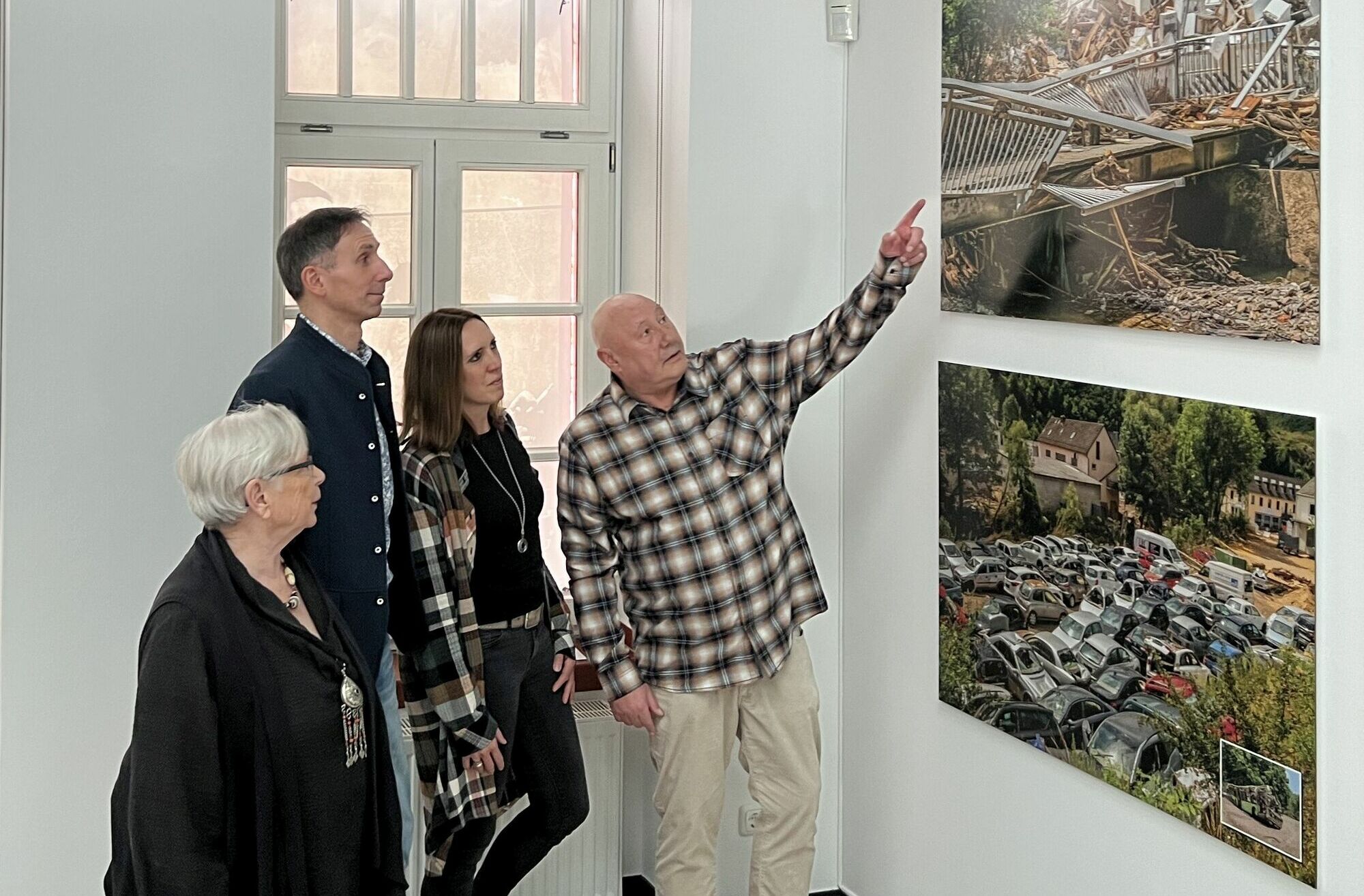 Die Ausstellung erhebt nicht den Anspruch, die Geschichte der Flut zu dokumentieren. Sie zeigt einzelne Facetten, die in der Erinnerung bleiben, wie DLRG-Helfer auf dem Weg zur Menschenrettung, die Trauer um die Todesopfer, so an der Urftbrücke am Bahnhof in Gemünd, die Fahrzeugschlange vor der Müllsammelstelle, aber auch ein vermutlich bei vielen bereits in Vergessenheit geratenes, aber damals ausgesprochen wichtiges Detail: In kürzester Zeit wurden 100 mobile WC-Häuschen »zum allgemeinen Gebrauch« im Stadtgebiet aufgestellt.