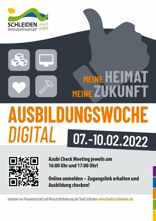 Es ist wieder soweit: Die Stadt Schleiden führt bereits zum zweiten Mal gemeinsam mit ansässigen Unternehmen eine digitale Ausbildungswoche für die Schülerinnen und Schüler sowie alle Ausbildungsinteressierten durch. Vom 7. bis 10. Februar finden täglich um 16 Uhr und um 17 Uhr digitale Treffen mit Auszubildenden der beteiligten Unternehmen statt.