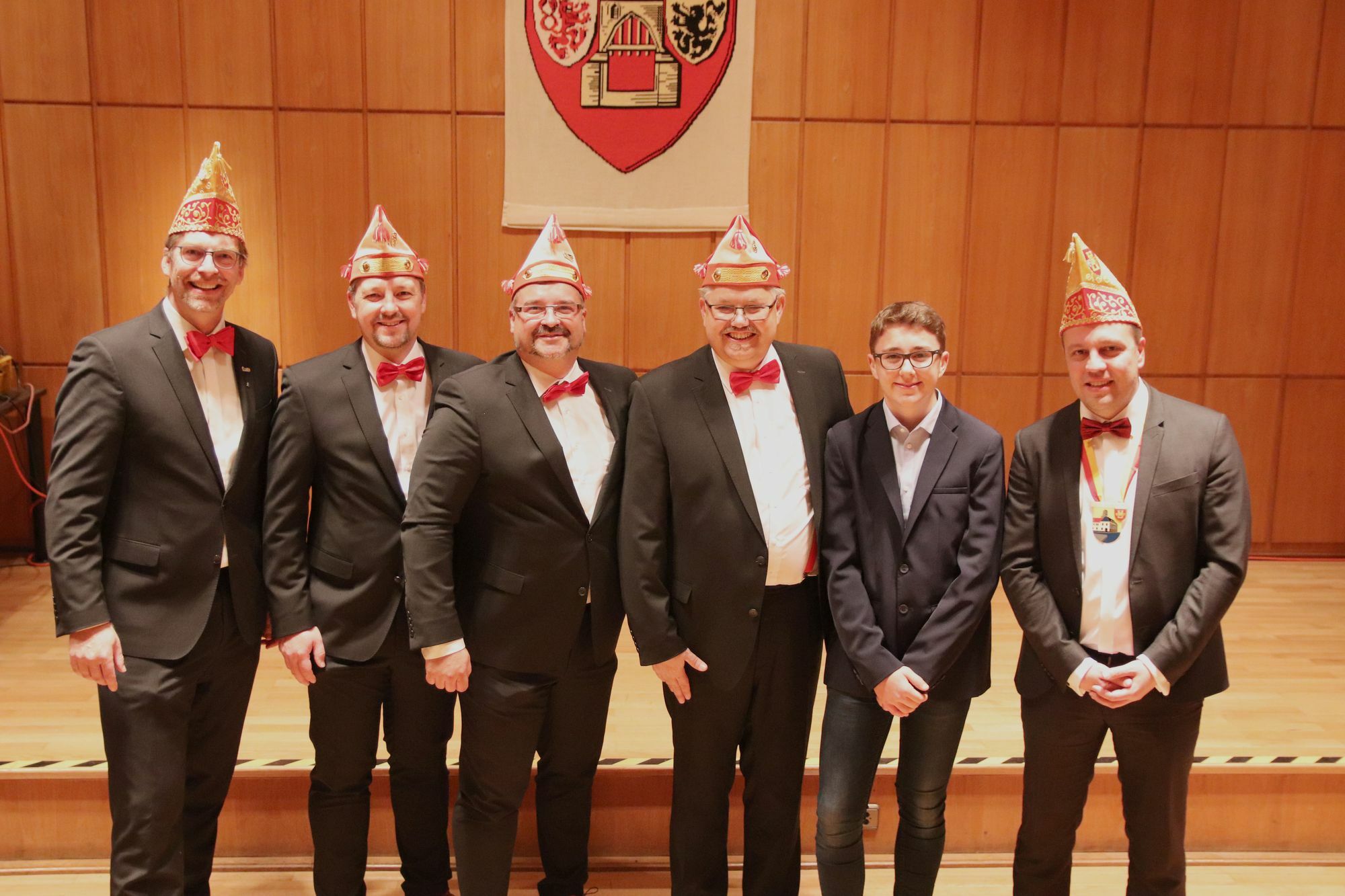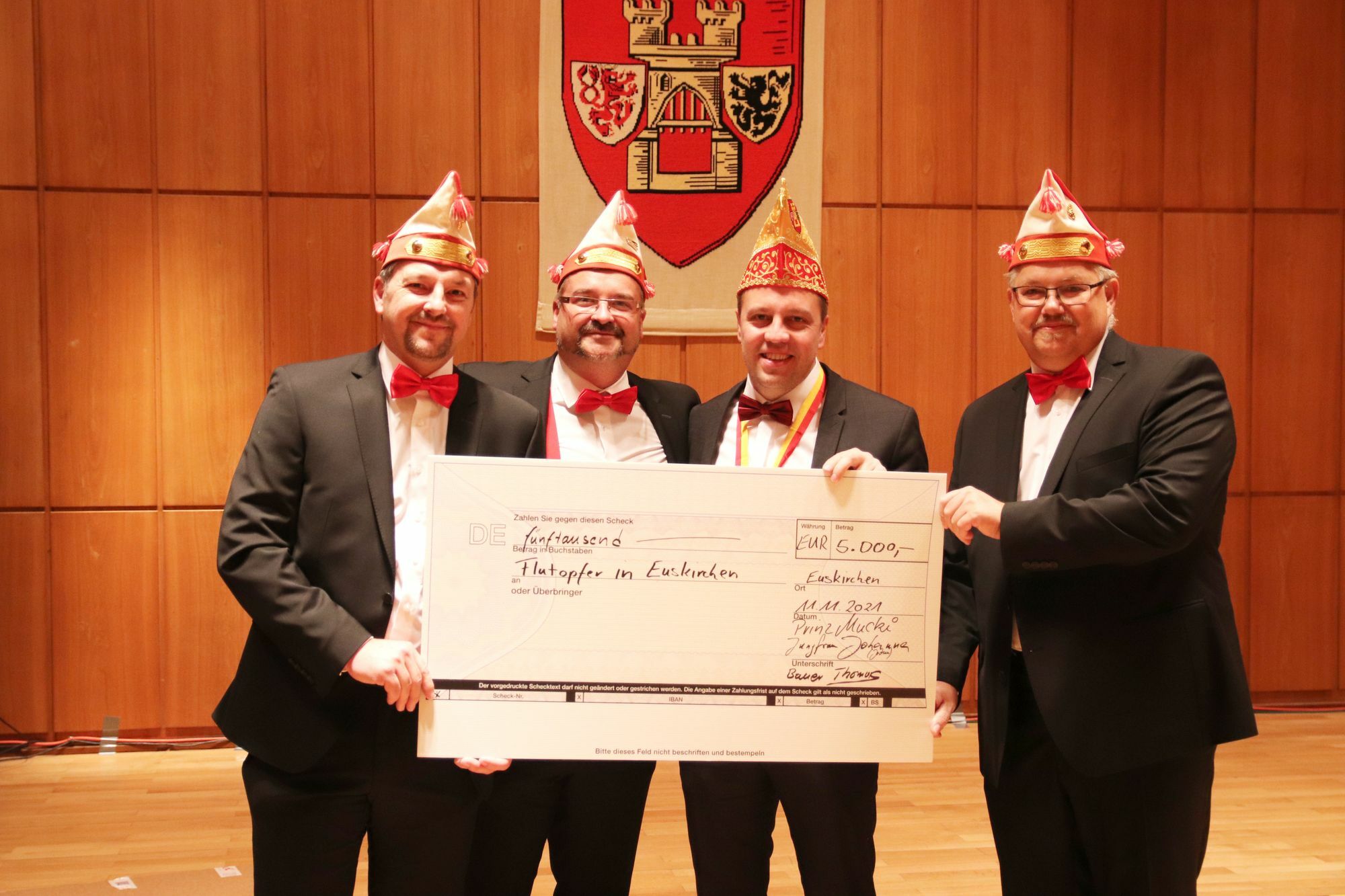 Dabei wurde auch eine Premiere gefeiert: Markus Tews (Prinz), Jochen Tews (Jungfrau) und Thomas Wierum (Bauer) sowie Joos Tews (Küfer) werden statt nur für eine jecke Jahreszeit für die beiden kommenden Sessionen die närrische Herrschaft über die Kreisstadt übernehmen. Nach der Vorstellung traten mehrere Formationen der Prinzengarde Euskirchen auf, aus der auch die drei Tollitäten stammen. Bürgermeister Sacha Reichelt wünschte den vier Jecken zwei erfolgreiche Sessionen und eine gute Zeit im Euskirchener Karneval. Nach dem stimmungsvollen Programm beglückwünschten die anwesenden Vertreter der Karnevalsgesellschaften sowie der Fraktionen aus dem Rat die designierten Tollitäten. Zum Abschluss hatte das designierte Dreigestirn noch eine dicke Überraschung für die Gäste im Ratssaal: Von dem Geld, das normalerweise für Wurfmaterial ausgegeben wird, spendeten die drei Jecken 5000 Euro zugunsten der Flutopfer an die Städtische Nothilfe. Eine tolle Geste zum Abschluss eines gelungenen Abends.