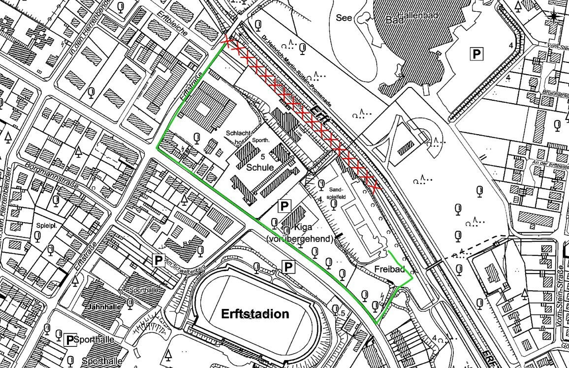 Noch sei nach Angaben des Erftverbands nicht absehbar, wie lange die Arbeiten andauern. Fußgänger werden gebeten, den Weg am Keltenring zu nutzen. Hier gibt's eine Übersichtskarte.