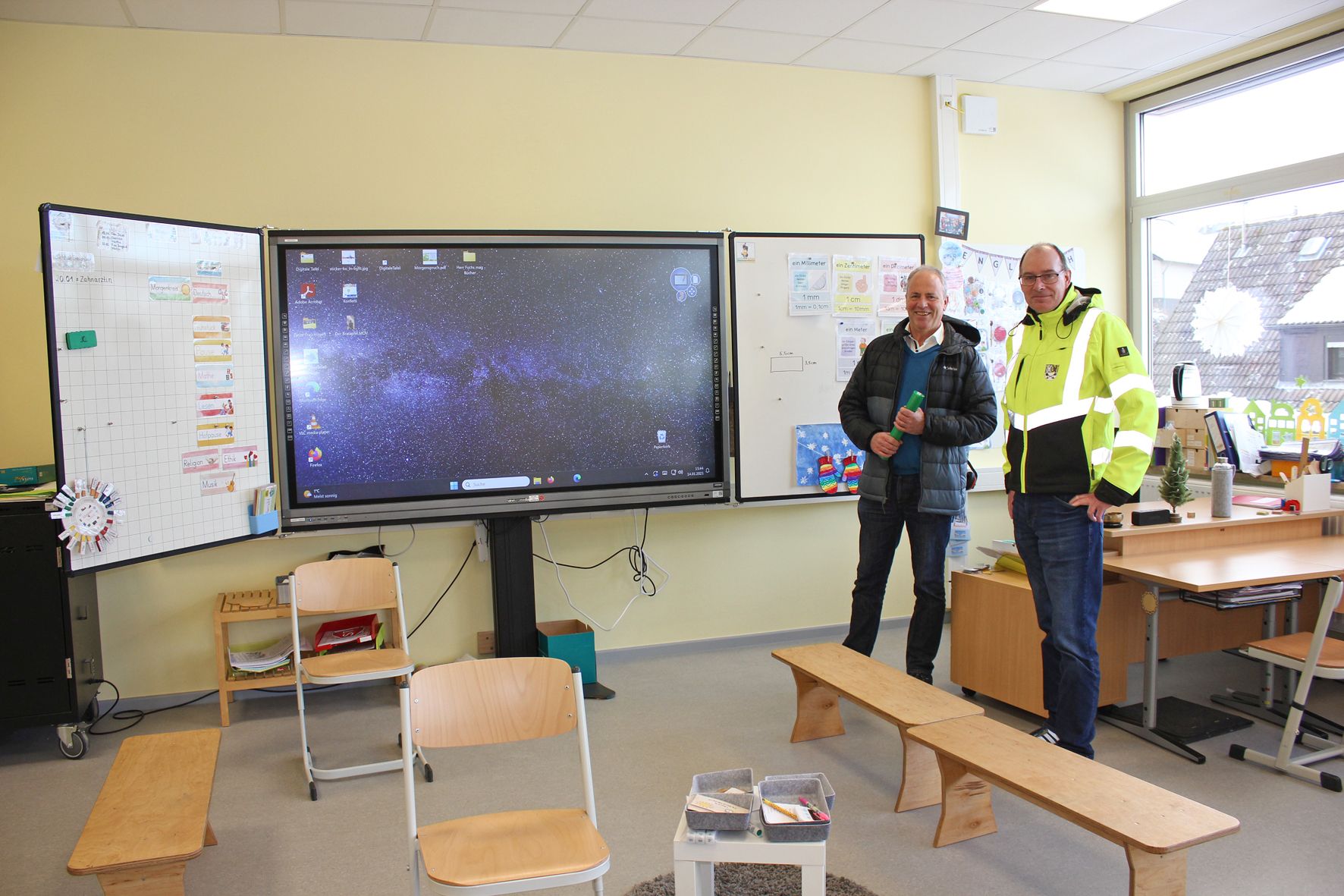 Nach den Sommerfeien 2024 konnte ein Trakt im Obergeschoss bereits wieder bezogen werden, dort werden seitdem die Kinder der dritten Klassen unterrichtet. Hell und freundlich muten die Räumlichkeiten an, was nicht nur baulichen Aspekten, sondern auch dem pädagogischen Konzept geschuldet ist. Nicht nur an der Fensterseite, sondern auch zum Gang hin sind die Räume mit großen Glasfronten versehen. Sie erlauben einen Blick in das Klassengeschehen, in dem die Lehrkräfte mithilfe moderner Smartboards unterrichten. »Das allerdings war auch vor der Flut schon so«, berichtet Lothar Schatten.