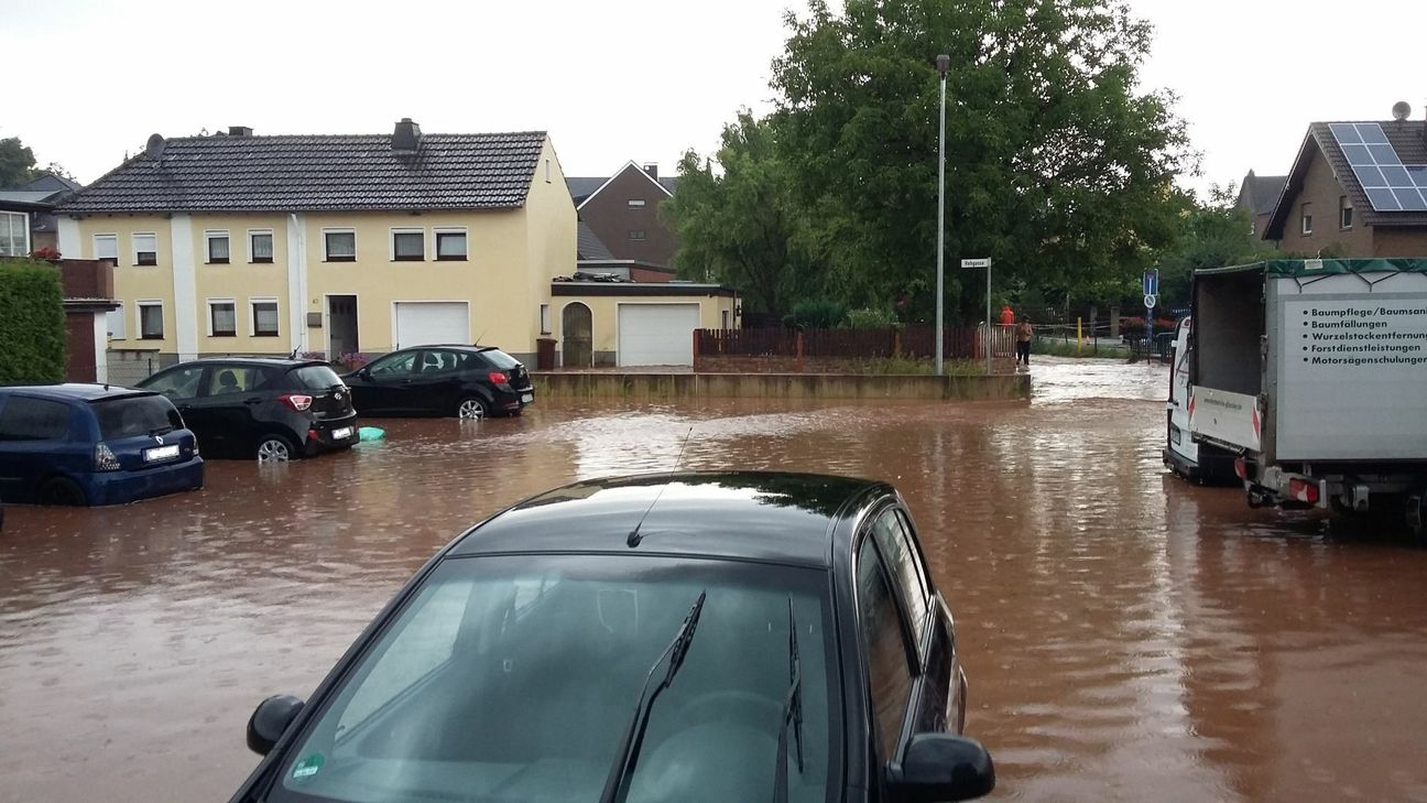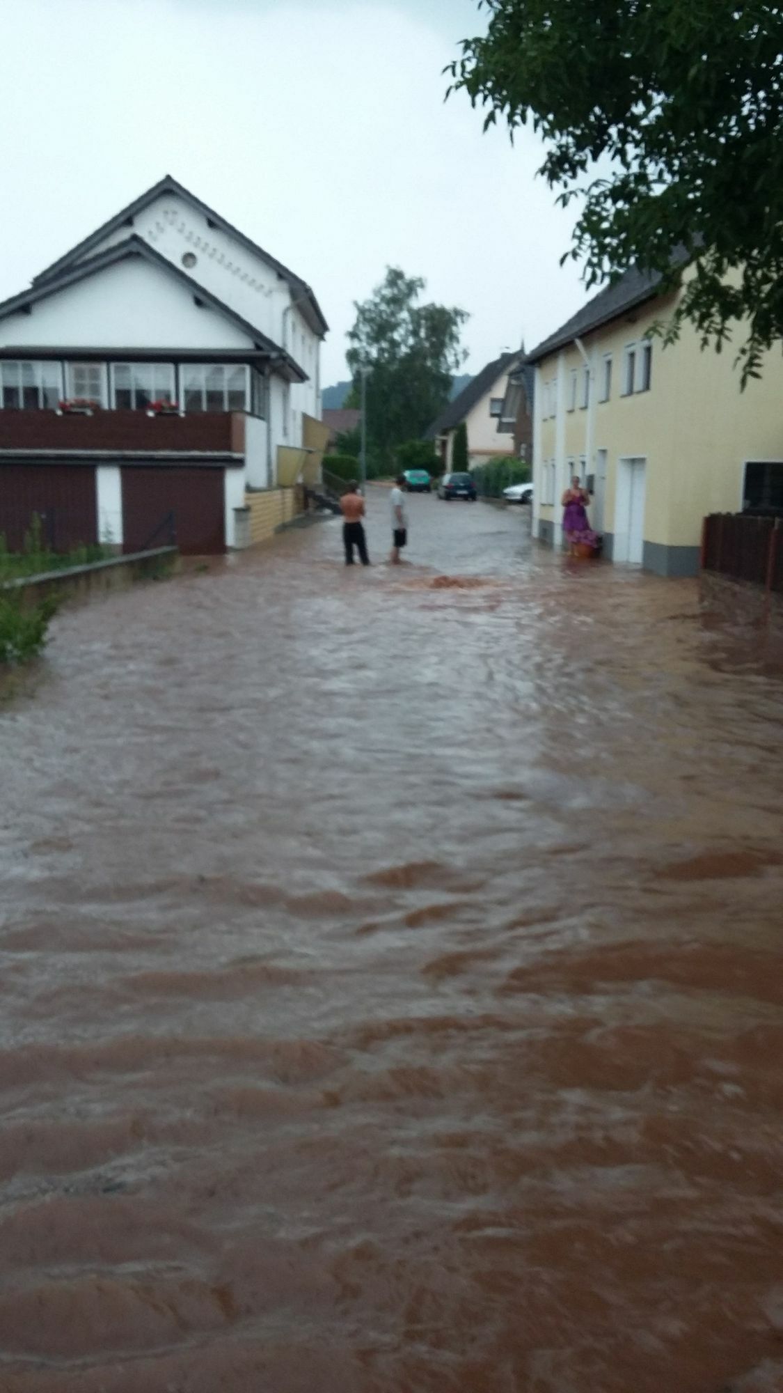 Als am Donnerstagnachmittag um 16.16 Uhr der Sturzregen über dem Stadtgebiet Mechernich einsetzte, ahnte noch niemand von den Ausmaßen dieses Unwetters. Doch dann liefen die ersten Keller voll und Straßen standen schnell unter Wasser. Bis 18.33 Uhr waren es bereits 408 Einsatzstellen. Die Zahl der Hilfesuchen über den Notruf 112 stieg bis 23.30 Uhr auf 584 an. Die Kreisverwaltung meldet, dass im Kernort Mechernich bis Freitagmorgen 10.36 Uhr eine noch nicht verbindlich festzulegende Anzahl an Gebäuden und Wohnungen stark beschädigt ist. Unter anderem war das Kreiskrankenhaus Mechernich von Wassereintritt betroffen, welcher sich jedoch nicht auf die Patientenversorgung auswirkte. Weitere Gebäudeschwerpunkte unter anderem: Flüchtlingsunterkunft im ehemaligen Unteroffiziersheim der Bundeswehr, Produktionshallen der Mechatronics Mechernich, REWE-Markt-Tiefgarage und –Verkaufsräume, RWE-Verteilstation. Auch Kommern wurde heftig vom Starkregen heimgesucht. Hier wurden Straßenzüge bis zu einer Wasserhöhe von 1,50 m überschwemmt. Mehrere Personen mussten in ihren Wohnungen und Häusern das Erdgeschoss verlassen und sich in höhere Geschosse begeben. Ein weiteres Problem: aufgeschwemmte Heizöltanks. Zudem wurden in Kommern Brücken massiv unterspült, sodass diese für eine Nutzung derzeit keinesfalls freigegeben werden können. Eintretendes Wasser beschädigte auch das Feuerwehrgerätehaus Kommern erheblich. Während auf der B 266 ein Baum auf einen Pkw gestürzt war und die im Auto eingeklemmte Person von der Feuerwehr gerettet und ins Krankenhaus eingeliefert werden musste, setzte die Feuerwehr bei der Rettung einer körperlich eingeschränkten Person ein Schlauchboot ein. In Obergarzem/Firmenich mussten einige Straßenzüge vom Strom getrennt werden, da der Veybach im Zusammenlauf mit dem Bleibach über das Ufer getreten war. Das THW stellte eine Stromversorgung sicher, sodass die Hauspumpen weiterhin ihre Arbeiten verrichten konnten. Durch den Sturzregen in Mechernich führte auch der Rotbach erhebliche Wassermengen. Diese führten im Stadtgebiet Zülpich gerade im Bereich des Zusammentreffens von Rotbach und Bleibach zu möglichen Gefährdungen der Anlieger – insbesondere in Mülheim-Wichterich. Hier kamen vorsorglich Sandsäcke zum Einsatz. Wie die Agentur ProfiPress berichtet, wurde das für das Wochenende geplante Hardrock-Festival im Mühlenpark ersatzlos gestrichen, weil das Gelände, auf dem auch schon einige Besucher zelteten, unter Wasser stand. Ebenfalls habe die Stadtverwaltung Mechernich mitgeteilt, dass vom Hochwasser Betroffene Sperrmüll und Unrat kostenlos an der Mülldeponie in Strempt abgeben können. Außerdem habe die Stadt alle verfügbaren Müllcontainer aufgestellt. Der ehemalige städtische Mitarbeiter Heinz Reuter aus Kommern sagte: „Ich war 47 Jahre bei der Stadt, aber sowas wie hier habe ich noch nicht erlebt.“ Weitere Fotos: Feuerwehr Mechernich