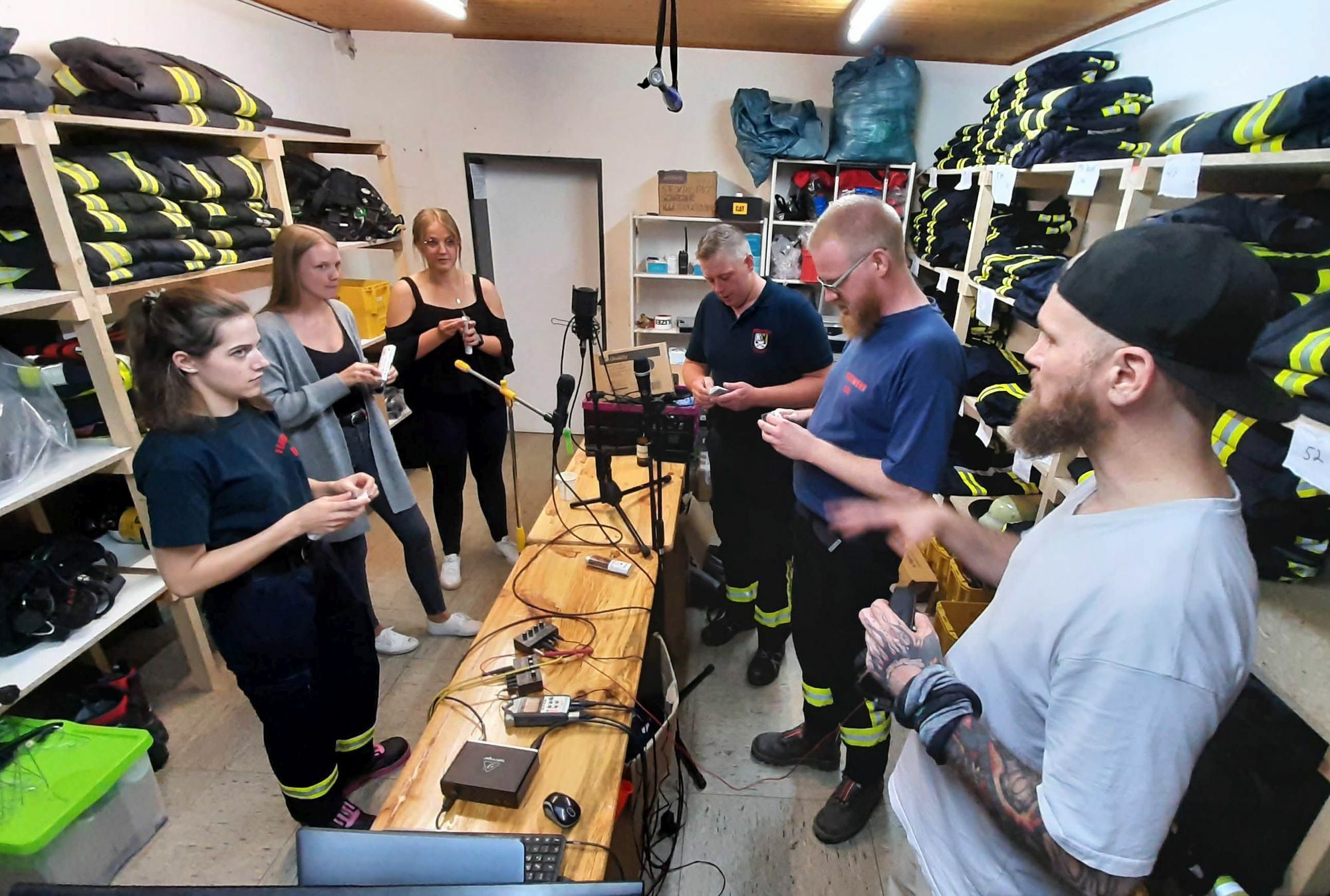 Um dem Ganzen noch mehr Klang zu verleihen wurde Michael Thelen von der Musikkapelle Kall mit ins Boot genommen um den Akkordeon-Part zu übernehmen. Weil der sich aber derzeit in Bruchsal aufhält, schickte ihm Bernd Züll die Aufnahmetechnik per Paketdienst zu, wo Thelen seine Parts einspielte. Die Video-Macher wollten aber nicht nur Musik-Profis an Bord haben, sondern besonders auch die Feuerwehr. „Weil ich etwas für die ganze Gemeinde machen wollte, war klar, dass alle drei Standorte dabei sein mussten“, so Züll. Mit den Zug- und Gruppenführern Daniel Rütz in Kall, Jochen Völler in Sistig und Kerstin Brandhoff in Wahlen wurden zum Singen des Veedels-Liedes Aufnahmetermine gemacht.