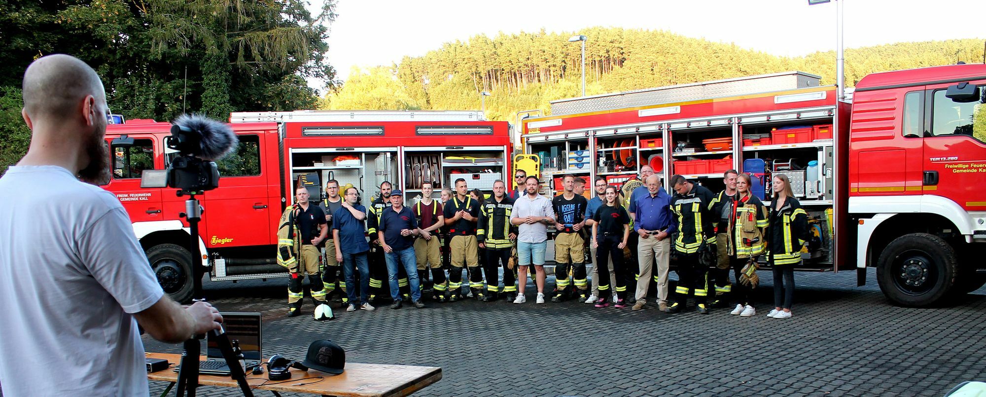 Um alle Gemeindebezirke am Projekt zu beteiligen, wurden auch die Ortsvorsteher (OV) zur stimmlichen Unterstützung der Feuerwehr-Chöre eingeladen. In Kall reihten sich die OV Stefan Kupp (Kall), Fabian Nowald (Urft), Emmanuel Kunz (Golbach) und Hans Reiff (Scheven) in den Feuerwehr-Chor mit ein. In Sistig sangen die OV Lothar Maevis (Rinnen), Thomas Müller (Sötenich) und Hans-Dieter Schäfer (Krekel) mit. Schäfers Stimme verstärkte auch den Chor der Löschgruppe Wahlen, bei denen Ortsvorsteher Roman Hövel mitsang. Die Ortsvorsteher Karl Vermöhlen (Sistig) und Dustin Möhrer (Keldenich) hatten Foto- und Videomaterial beigesteuert, konnten aber aus beruflichen Gründen bei den Drehterminen nicht anwesend sein. Mit viel Geduld und Technik der Video-Macher gingen die Drehtermine an den drei Standorten über die Bühne.