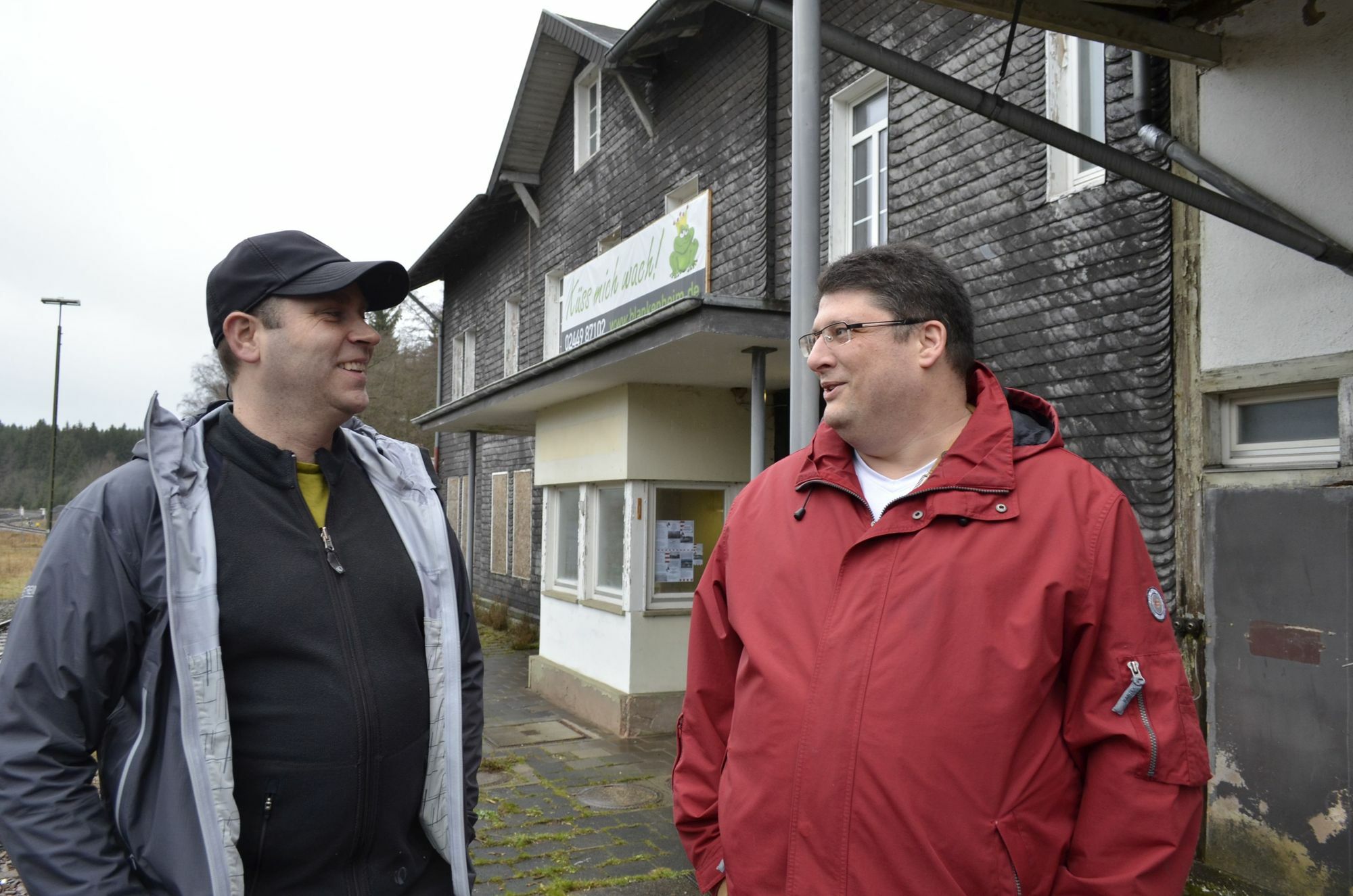 Manuel Schwabe und Alex Oeliger (v.re.) sind Sprecher der IG Bahnhof, die das Gebäude erhalten und für Pendler sowie den Tourismus nutzbar machen möchte.