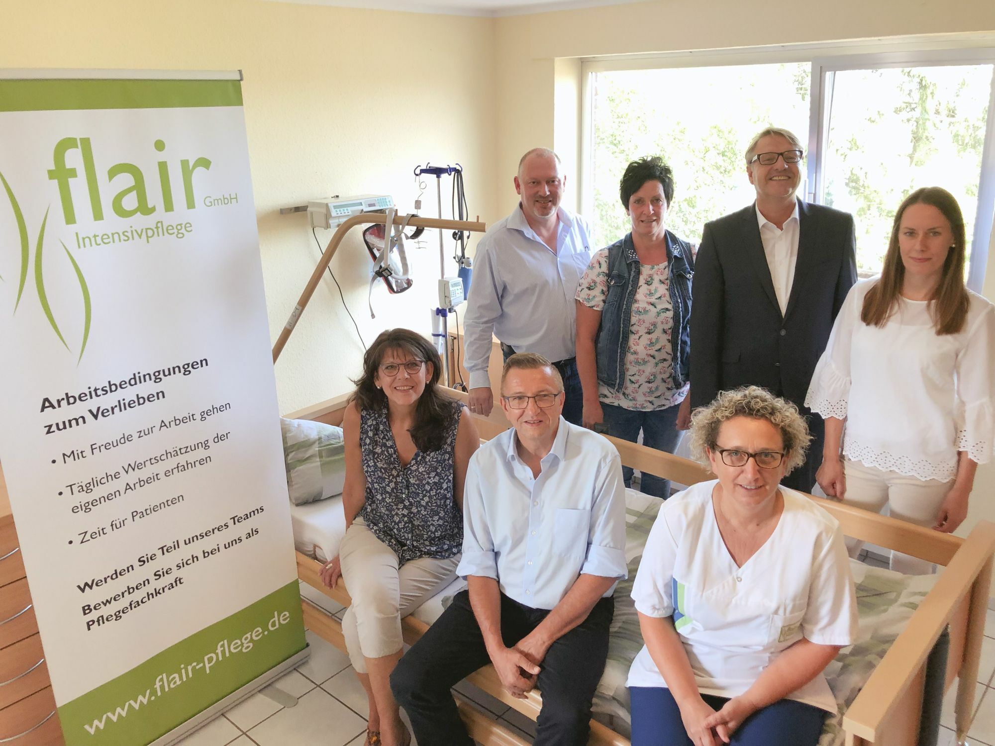 Dort ist das Unterrnehmen »Flair« ansässig, ein Pflegedienst, der sich auf Beatmungs- und Intensivpatienten spezialisiert hat und dementsprechend qualifiziertes Personal braucht. »Wir beschäftigen derzeit 75 Kräfte, könnten aber zehn weitere brauchen«, macht Michael Fink, neben Jörg Koch Geschäftsführer des Unternehmens, auf den Fachkräftemangel in den Pflegeberufen aufmerksam.