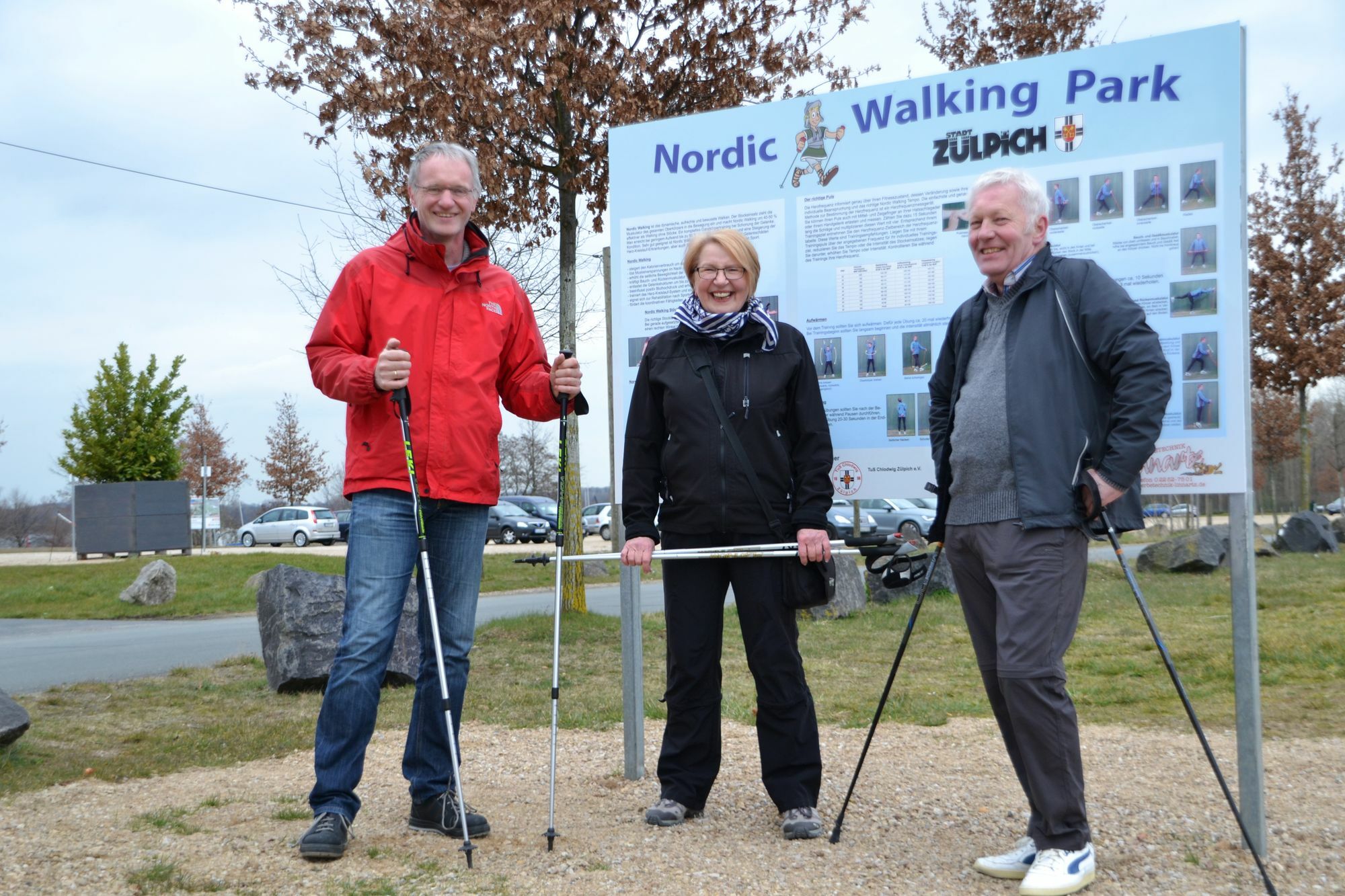 Die zentrale Start-Ziel-Tafel als Ausgangspunkt von fünf verschiedenen Routen musste bei Einrichtung des neuen Parkplatzes für den Gartenschaupark zurückgebaut werden. Darüber hinaus war auch die Ausschilderung der Kurse durch Vandalismus empfindlich beeinträchtigt, teilweise nur noch ansatzweise vorhanden. Um die ursprünglich gut angenommenen Nordic-Walking-Strecken nun wieder nutzen zu können, hatte in den zurückliegenden Wochen ein Team von Ehrenamtlern um Margrit Adams-Scheuer aus dem Arbeitskreis Tourismus im Zülpicher Geschichtsverein die Aufgabe übernommen, die einzelnen Kurse abzugehen, auf Begehbarkeit zu überprüfen und vor allem Ergänzungs- und Ersatzbedarf bezüglich der Beschilderung zu ermitteln. Nachdem die Stadtverwaltung die benötigen Schilder bereitgestellt hatte, übernahm dieses ehrenamtliche Routenteam, bestehend aus Ulla Knapp, Wilhelm Kau und Markus Müsch auch deren Montage. Damit konnte auch die Start-Ziel-Tafel in der Nähe des Fahrradparkplatzes gegenüber dem Eingang zum Gartenschaupark neu aufgestellt werden. Ergänzend zur überarbeiteten Ausschilderung erscheinen in Kürze Flyer zu den fünf Routen mit unterschiedlichem Schwierigkeitsgrad. Sie werden im Rathaus und am Eingang zum Gartenschaupark kostenfrei erhältlich sein. Bei einem Ortstermin weihten das Routenteam, Mitglieder des Arbeitskreises Tourismus und beteiligte Vertreter der Stadtverwaltung den Zülpicher Nordic-Walking-Park wieder ein. Alle Versammelten freuten sich, dass durch dieses ehrenamtliche Engagement mit Unterstützung der Verwaltung bei langsam steigenden Temperaturen auch das Nordic-Walken rund um Zülpich endlich wieder aufleben kann.