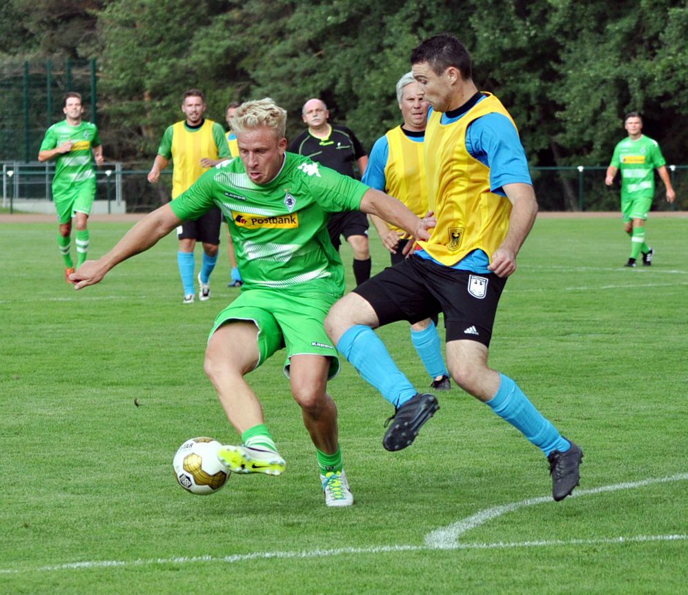 In der Tat hatte Betreuer Achim Züll, Soldat in Mechernich und Trainer des SV Nierfeld, seine Bundeswehr-Kicker gut auf das Spiel vorbereitet und mit dem Torsteher Dirk Scher einen erfahrenen Landesliga-Keeper zwischen die Pfosten gestellt. Scher machte so manche gute Torchance der Borussen mit tollen Paraden zunichte. Gefährlichste Stürmer der Gladbacher waren Mike Hanke (77 Spiele/13 Tore) und Jörg Criens (290/92) die aus allen Rohren auf das Bundeswehr-Tor schossen. Dennoch hielt sich am Ende die Niederlage der Soldaten mit 1:7 Toren in Grenzen. Darüber freuten sich auch der Standortälteste Christian Reichert und der Moderator Andreas Duwe. Und auch mit der Leistung des Strempter Schiedsrichters Timo Ott und den Linienrichtern Kevin Ott und Simon Happrich waren nach 90 Minuten alle Beteiligten zufrieden. Das Benefiz-Spiel gegen die Weisweiler-Elf fand im Rahmen eines Sportfestes statt, mit dem diverse Neubauten innerhalb der Sportanlage ihrer Bestimmung übergeben wurden.