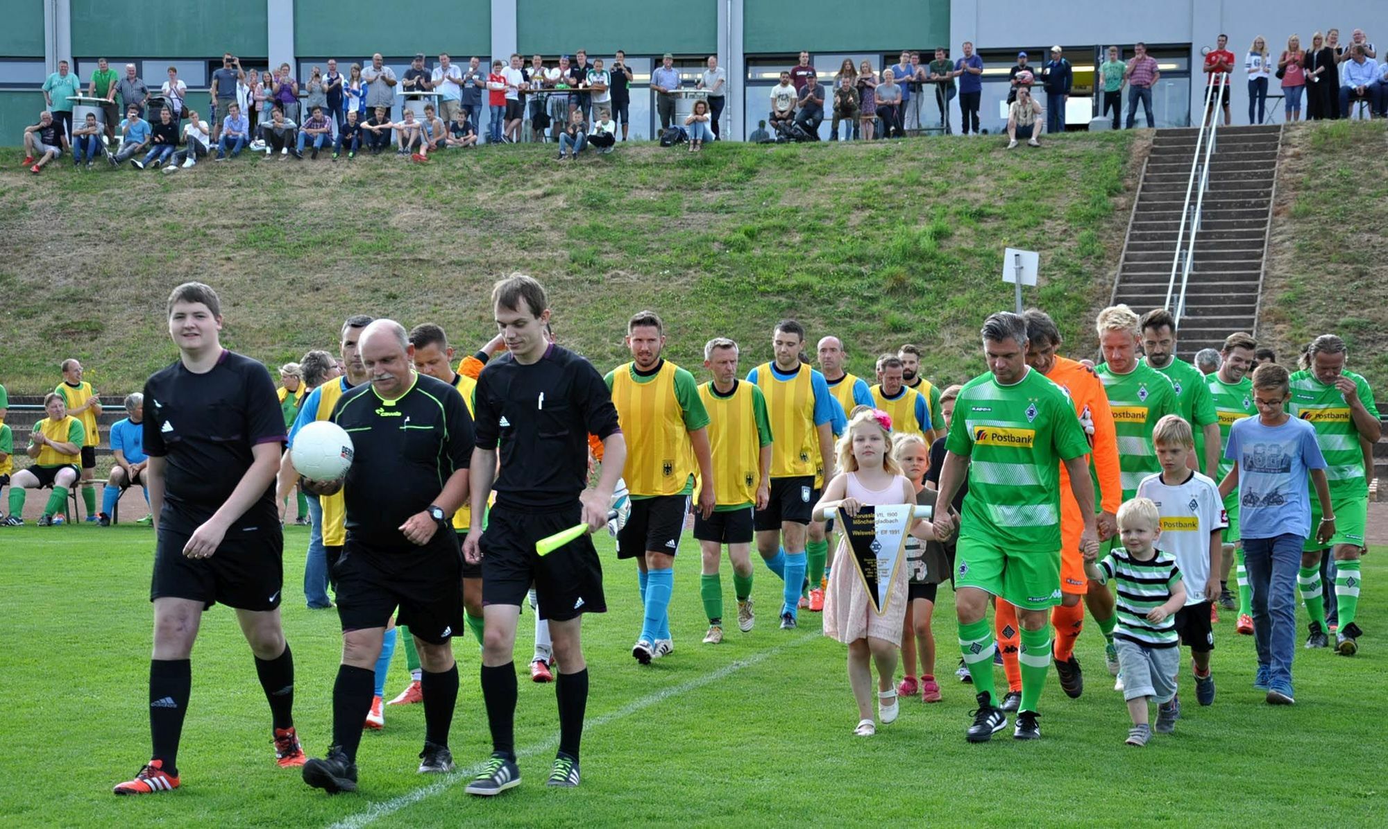 Für die Begeisterung der Borussen über den gepflegten Platz hatte der Bundeswehr-Mitarbeiter Uli Claßen gesorgt, der den Rasen auf echtes Bundesliga-Niveau gebracht hatte, berichtete später der Oberstabsfeldwebel Andreas Duwe aus Kall, der das Spiel der Weisweiler-Elf, die zu den erfolgreichsten und beliebtesten Traditionsmannschaften in Deutschland zählt, zugunsten der Hilfsgruppe organisiert hatte. Bekannte Alt-Stars wie Stephan Paßlack, Claus Reitmaier, Jörg Neun, Mike Hanke, Thorben Marx, Peter Wynhoff, Hans-Jörg Criens oder Kalle Pflipsen liefen für die 16-köpfige Alt-Borussen-Mannschaft auf dem Mechernicher Rasen auf.