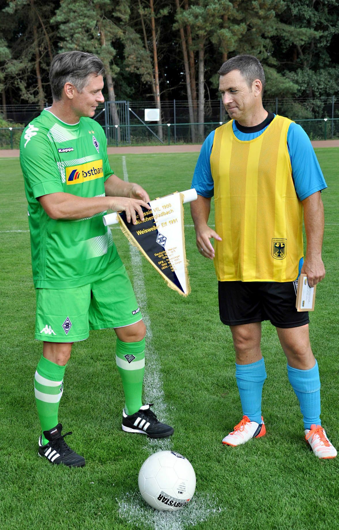 Ihnen gegenüber stand ein 32-köpfiger Kader der Eifeler Bundeswehr-Auswahl, in der auch der Chef des Mechernicher Bundeswehrstandortes, Oberstleutnant Christian Reichert, mitspielte. Dass die Kicker der Weisweiler-Elf das Fußballspielen noch nicht verlernt haben, zeigen zwei Spiele aus jüngster Vergangenheit, bei denen die Ex-Profis vom Niederrhein vor drei Wochen eine Mannschaft aus Böddenstedt mit 19:1 Toren überrollten und eine Woche später eine Auswahl des Vatikans mit 21:4 Toren „abfertigten“. Die Befürchtung, dass es auch beim Spiel gegen die Bundeswehrauswahl ein Schützenfest zugunsten der Borussen gebe, erwies sich allerdings als unbegründet. Am Ende gewannen die Weisweiler-Jungs zwar mit 7:1 Toren, doch die Eifeler Soldaten machten den Ex-Profis das Leben über 90 Minuten hinweg mehr als schwer. Das Spiel war schon 20 Minuten alt als immer noch kein Tor gefallen war und der Ex-Gladbach-Profi Peter Wynhoff (240 Spiele/34 Tore) anerkennen musste: „Die können richtig gut Fußball spielen“.