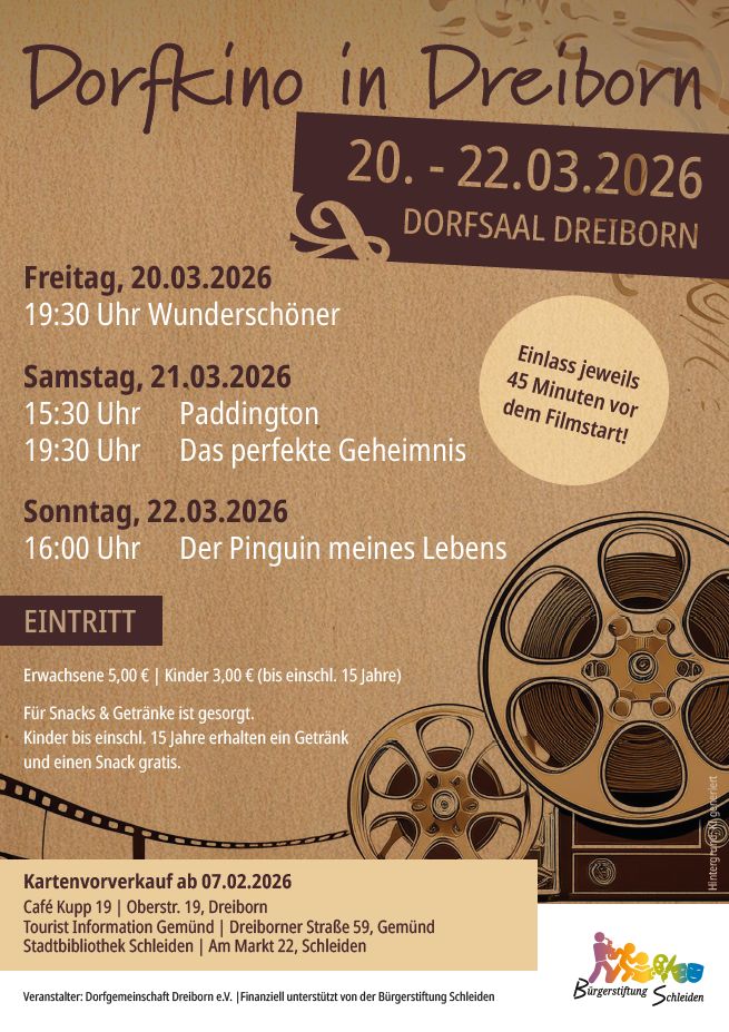 Zum dritten Mal in Folge verwandelt sich der Dreiborner Dorfsaal in ein gemütliches Kino: Von Freitag, 20. März, bis Sonntag, 22. März, zeigt der Dorfverein Dreiborn insgesamt vier Filme für Kinder, Familien und Erwachsene.