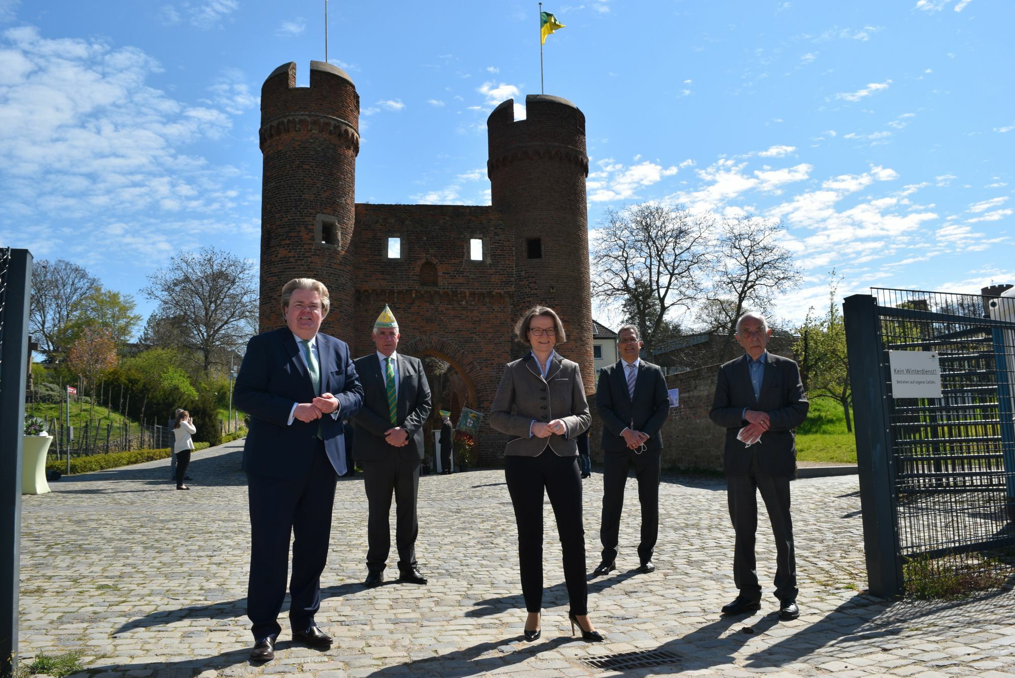 Fördermittel des Landes Nordrhein-Westfalen sollen jetzt, in Anlehnung an das historische Vorbild, den Wiederaufbau des Stadttors ermöglichen. Den entsprechenden Förderbescheid über 612.000 Euro aus dem Programm »Heimat. Zukunft. Nordrhein-Westfalen überreichte Ina Scharrenbach, Ministerin für Heimat, Kommunales, Bau und Gleichstellung des Landes Nordrhein-Westfalen am Dienstag persönlich in Zülpich. «Keiner kann die Zeit zurückdrehen, auch nicht den für Zülpich so schicksalhaften Heiligabend 1944. Aber der Glücksklee mit vier lebhaften Stadttoren ist heute gesät worden«, erklärte Ulf Hürtgen anlässlich der Überreichung des Förderbescheids durch die Ministerin. Es gebe Menschen, die mit dem Wiederaufbau des Weiertors einen Traum haben, betonte Ina Scharrenbach. Und manchmal müsse man an seinen Träumen auch festhalten. »Und Irgendwann gibt es dann auch die Möglichkeit diese Träume auch zu realisieren«, sagte Scharrenbach und verwies dabei auf die bewilligte Förderung. Zudem lobte die Ministerin den ehrenamtlichen Einsatz der Hovener Jungkarnevalisten. »Es gehören einfach Menschen dazu, die dann auch noch sagen, wir machen sowas. Ohne diese Menschen geht es nicht«, sagte Schnarrenbach.