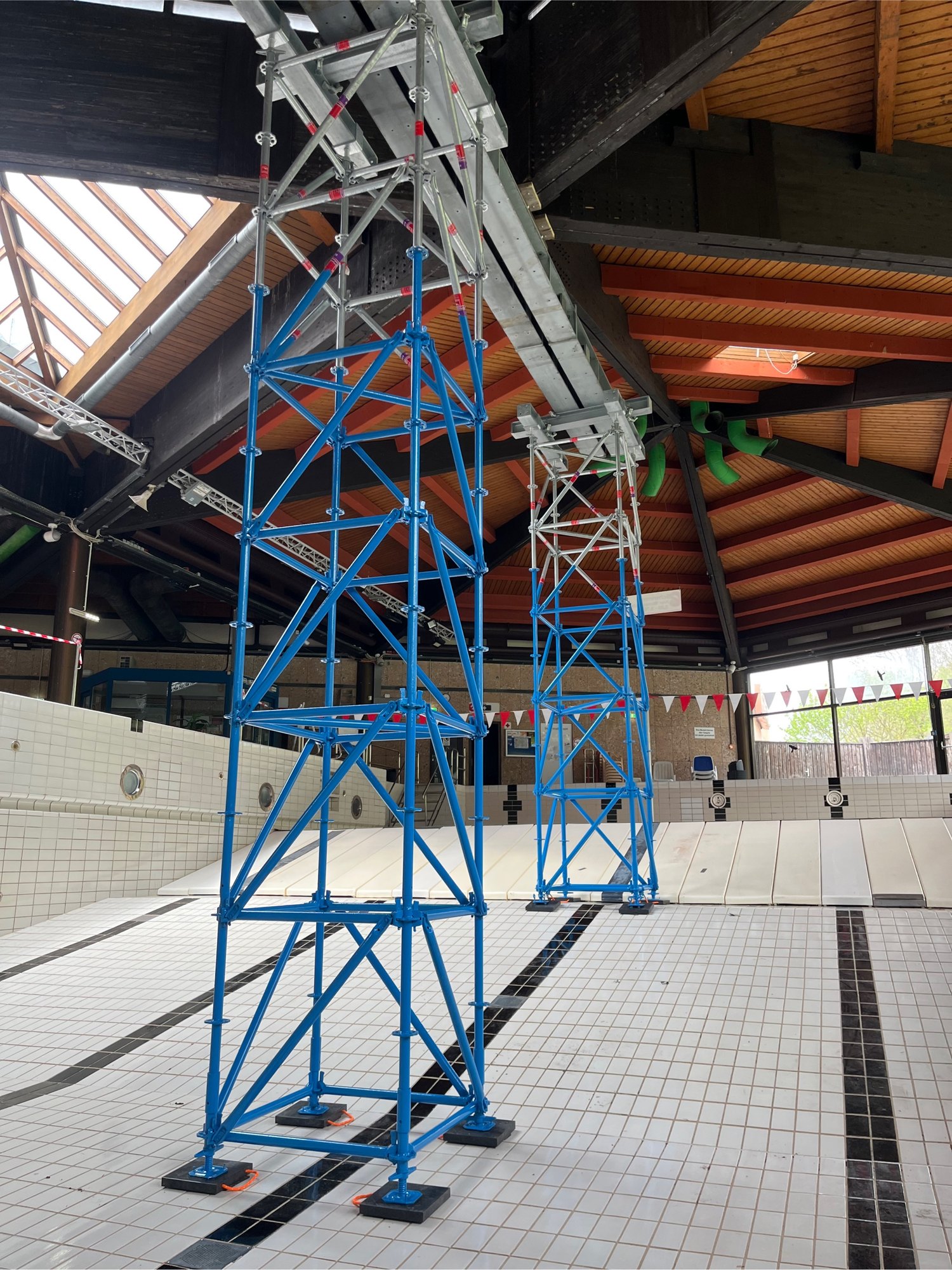 Was haben der Kölner Dom und das eifelbad gemeinsam? Nein, nicht die scheinbar endlose Bauzeit – sondern auffällige Gerüste. Während das markant am Dom hängende Gerüst seit einiger Zeit abgebaut ist, stehen im eifelbad nun zwei Gerüste mitten im Schwimmerbecken. Sie tragen einen Eisenträger, der den zentralen Knotenpunkt der Dachkonstruktion stützt – eine Konstruktion, die wohl ähnlich bemerkenswert ist wie ein Gerüst an einer Kathedrale.