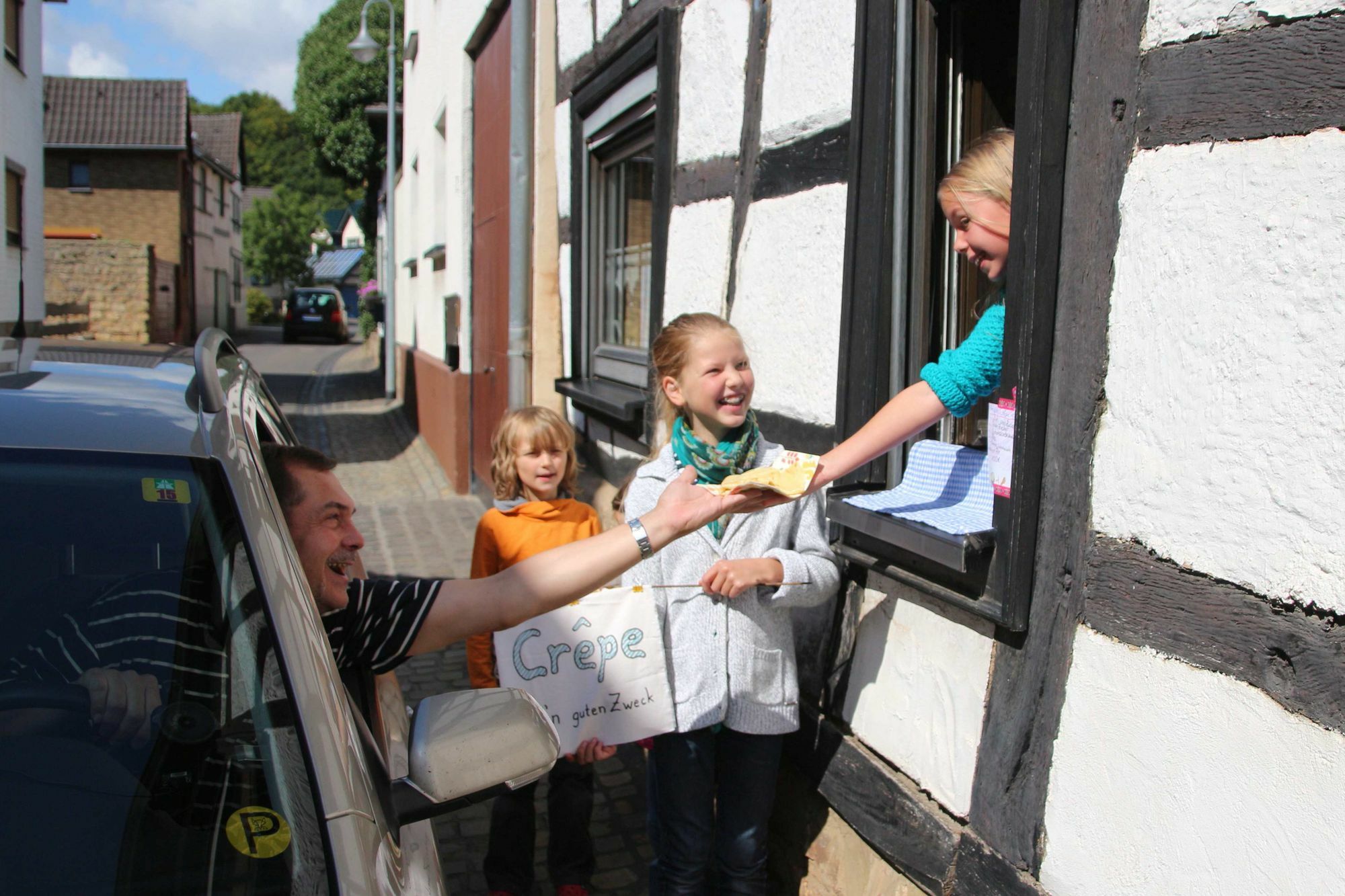 „Die Idee kam mir, als ich selber einen Crêpe gegessen habe“, erzählte Pia Kühn. Die Elfjährige besucht wie ihre Freundin Lily Schroeteler die Waldorfschule in Erftstadt. Unter dem Motto „Zusammen etwas bewegen und weltweit gute Schule machen“ werden Schüler aller Waldorfschulen beim „WOW-Day“ (Waldorf one World) aktiv, um mit dem Erlös ihrer Aktionen Schulen in aller Welt zu unterstützen. Mit Handzetteln „Crêpes für einen guten Zweck“ hatten die beiden Mädchen in den Tagen zuvor bei Nachbarn, Bekannten und Freunden auf ihre „Idee am Küchenfensterchen“ aufmerksam gemacht. So mussten Anne Welter und ihr Sohn Marcelo für den leckeren Imbiss nur die Straße überqueren. „Das ist eine tolle Idee, die ich gerne unterstütze“, lobte die Iversheimerin die beiden jungen „Köchinnen“, die derweilen auf Bestellung mit dem Teigrechen hauchdünne Crêpes herstellten. Der fünfjährige Marcelo zeigte sich von seiner Kreation mit Schokolade begeistert. „Der schmeckt gut!“ 16 Eier und ein Kilogramm Mehl hatten die beiden Freundinnen zu einem flüssigen Teig verarbeitet und nach einer Stunde bereits jede Menge Kunden bedient. Egal ob Zimt und Zucker, Banane, Schokolade oder Käse, die Iversheimer ließen es sich schmecken. So auch Stephan Sirrenberg. Er nutzte wie viele andere die Gelegenheit, vom Autofenster aus seine Bestellung aufzugeben. Die Wartezeiten, die durch den spontan ins Leben gerufenen „Drive-in“ entstanden, wurden von den Passanten mit Fassung getragen und ein Verkehrschaos in der schmalen Gasse blieb aus. Mit ihrer schönen Idee und ihrem unermüdlichen Einsatz an der Pfanne hatten Pia und Lily am späten Nachmittag ein nettes Sümmchen für Schulen in aller Welt gesammelt. (dg) https://www.freunde-waldorf.de/wow-day.html