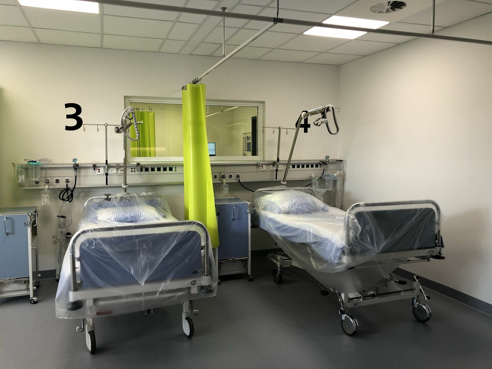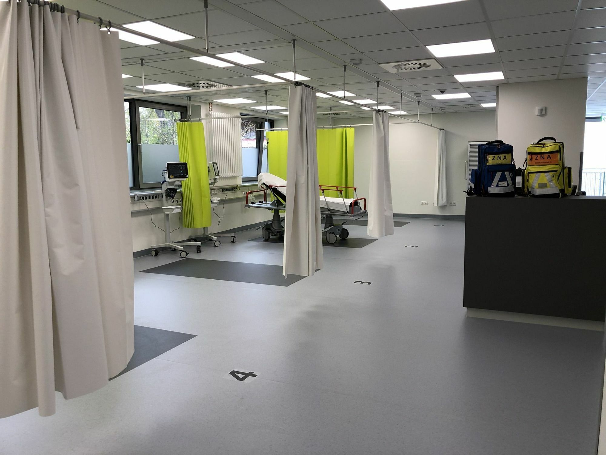 Und die findet in einem offenen Bereich statt, wo man mit flexiblen Vorhängen, fahrbaren Monitoren und Materialwagen arbeitet. Im Normalbetrieb - und der bedeutet rund 80 bis 100 Notfallpatienten innerhalb von 24 Stunden - sind dort fünf Behandlungsplätze vorgesehen, die bei Bedarf jedoch schnell erweitert werden können. Bis zu zehn Tragen reiche die Kapazität.