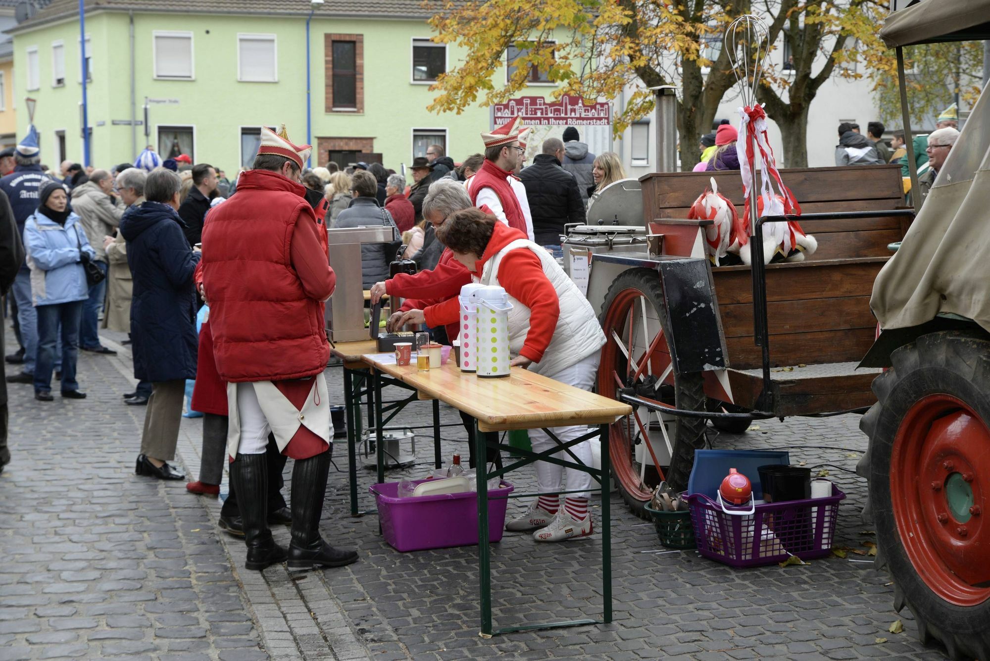 Das Wetter spielte ebenfalls mit, daher war auch der Samstag schon gut besucht, denn die Einzelhändler hielten ihre Türen bis 18 Uhr auf. Besonders der Sonntag lud dazu ein, sich an den Ständen mit den wärmenden Getränken zu stärken, denn es war recht kalt geworden. Um 11.11 Uhr eröffnete Horst Wachendorf, Präsident der Prinzengarde Zülpich, offiziell die Session. Alle vier Gesellschaften waren ans Münstertor gekommen, um gemeinsam die fünfte Jahreszeit einzuläuten und schon mal einen Blick auf Franz I. (Becker) zu werfen, der am 19. November proklamiert wird. Die Garden und Musikcorps sorgten außerdem für Unterhaltung und die Jecken freuen sich auf die kommenden Veranstaltungen. Ab 13 Uhr hatten dann auch die Geschäfte geöffnet und die Besucher des Martinsmarktes konnten nicht nur in den Auslagen der fahrenden Händler stöbern, sondern auch bei den Einzelhändlern der Römerstadt.