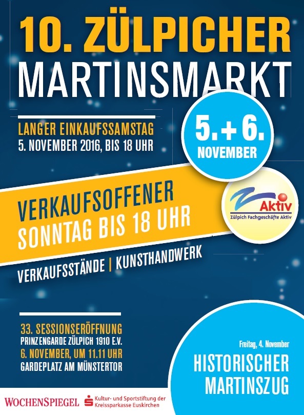 In der autofreien Innenstadt lässt es sich nicht nur entspannt flanieren. Auch öffnen die Fachgeschäfte ihre Pforten und ermöglichen dem Publikum am 5. November (bis 18 Uhr) ein verlängertes und am 6. November (zwischen 13 Uhr und 18 Uhr) ein zusätzliches Einkaufserlebnis. Aktuelle Kollektionen sowie spezielle Martinsmarkt-Aktionen und -Schnäppchen versprechen ein erfolgreiches Eintauchen in die Zülpicher Einkaufswelt. Das vielfältige Angebot der Kunsthandwerker, die sich mit ihren Marktständen durch das Stadtzentrum schlängeln, setzt ein weiteres Ausrufezeichen hinter die Veranstaltung. Ihren Auftakt bildet am Freitag, 4. November, der historische Martinszug, der sich um 17.15 Uhr ab dem Marktplatz in Bewegung setzt. Kleine und große Teilnehmer folgen mit ihren leuchtenden Laternen dem Sankt Martin hoch zu Ross durch die Römerstadt. Am Weiertor warten schließlich die kostenlosen Martinswecken auf die Kinder. Während sich das Samstag-Programm an Familien und ihren Nachwuchs richtet, treten sonntags die Fastelovendsjecken in Erscheinung. Pünktlich um 11.11 Uhr feiern sie unter Federführung der Prinzengarde am Münstertor in die fünfte Jahreszeit. Keine Frage, auch die zehnte Ausgabe des Martinsmarktes vereint Attraktionen und Traditionen zu einem vielversprechenden Mix im geschichtsträchtigen Ambiente der Römerstadt.