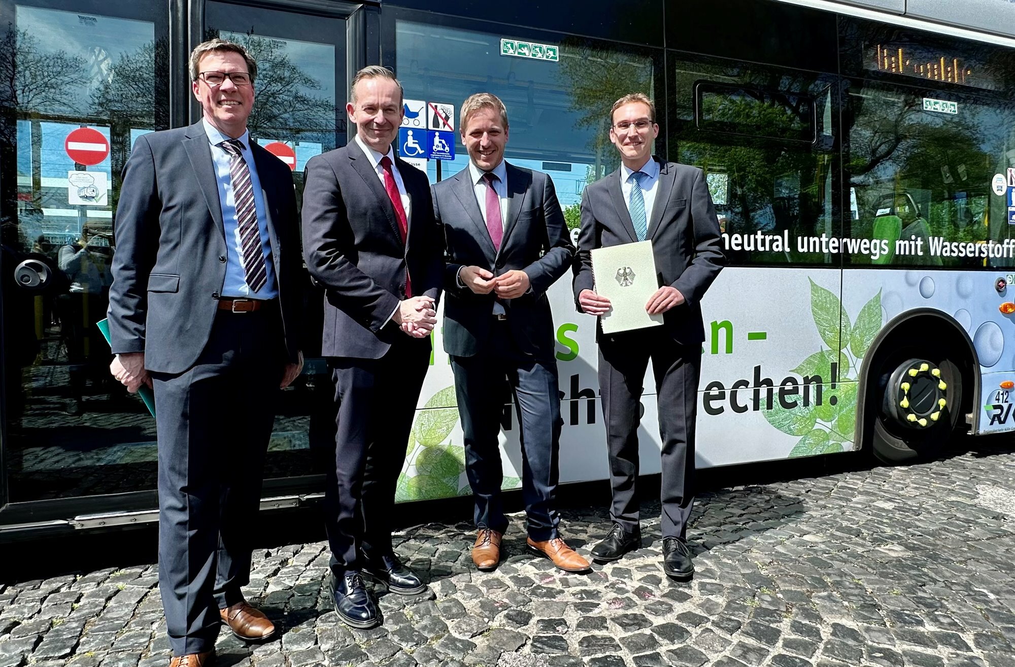 In den Bau einer Wasserstofftankstelle und eines Elektrolyseur in Mechernich sollen die 7,3 Mio. Euro fließen. Dort solle es dann ab 2027 möglich sein, neben privaten Autos auch Lastkraftwagen und bis zu 35 Brennstoffzellenbusse der RVK täglich mit Wasserstoff zu betanken. Landrat Markus Ramers: »Wir setzen stark auf diese umwelt- und klimafreundliche Technologie und wollen sie gemeinsam mit unseren Partnern voranbringen.« Gemeinsam mit Stephan Santelmann, dem Aufsichtsratsvorsitzenden der RVK, und RVK-Geschäftsführer Dr. Marcel Frank nahm er den Bescheid aus den Händen des Ministers in Düren entgegen.