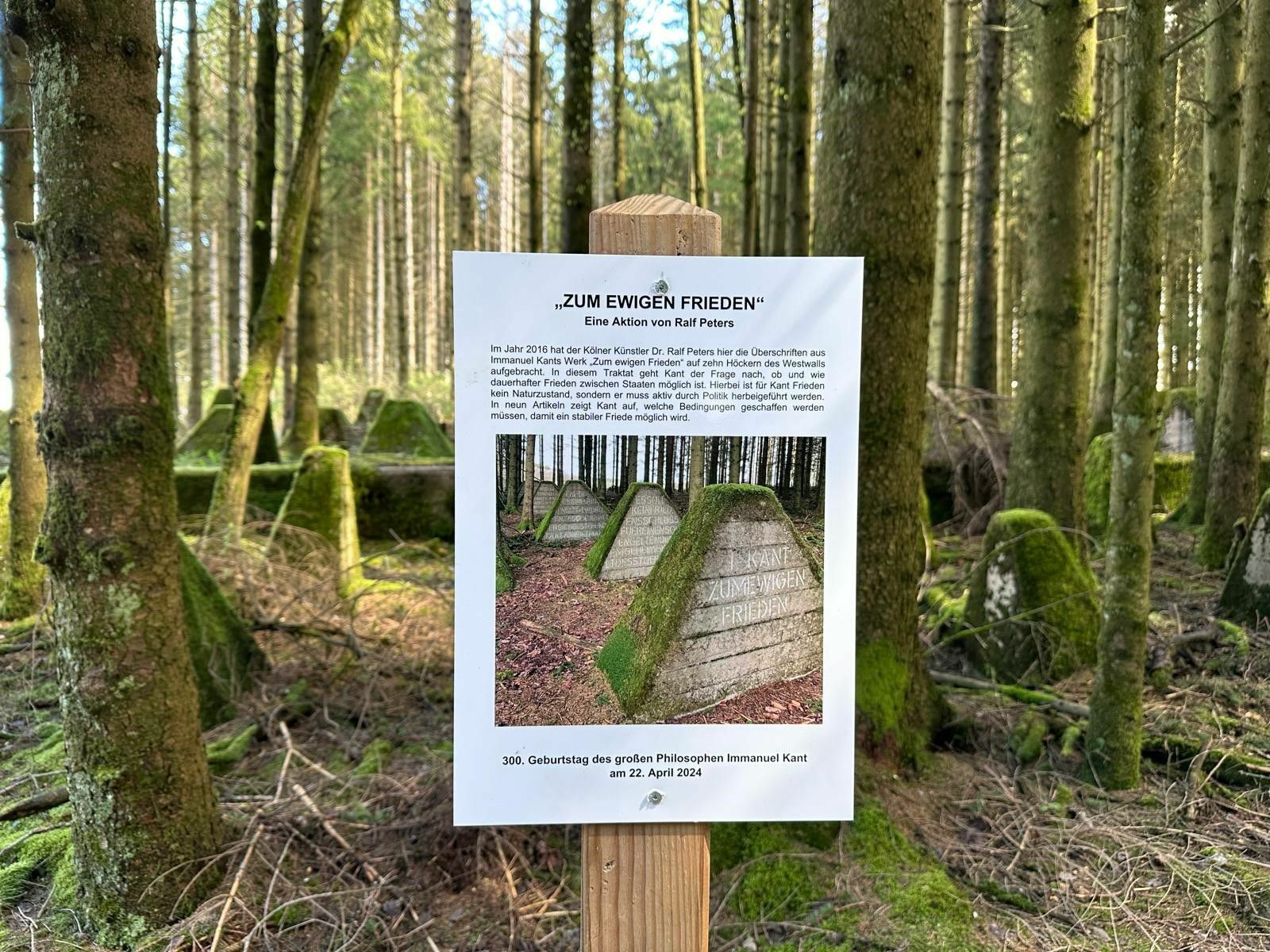 Was aber hat Hellenthal mit dem berühmten Denker aus Königsberg (heute Kaliningrad) zu tun? Im Jahr 2016 schuf der Kölner Künstler Dr. Ralf Peters in einem Waldstück bei Hollerath – zunächst illegal – ein Kunstwerk auf zehn Höckern des Westwalls mit den Überschriften aus Immanuel Kants Werk „Zum ewigen Frieden“.