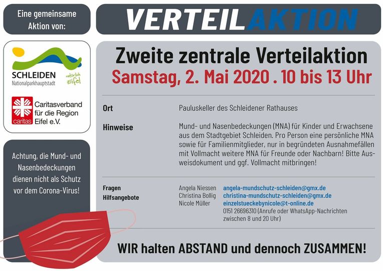 Die Gruppe ist inzwischen auf rund 30 Helfer angewachsen und hat bereits über 5.000 Mund- und Nasenbedeckungen gefertigt. Jeder kann für sich persönlich und Familienmitglieder eine MNA entgegennehmen. In begründeten Ausnahmefällen werden gegen Vorlage einer Vollmacht weitere MNA für Freunde oder Nachbarn ausgegeben. Zur Verteilaktion sollten daher ein Ausweisdokument und gegebenenfalls eine Vollmacht mitgebracht werden. Fragen oder Hilfsangebote können gerne an Nicole Müller: einzelstueckebynicole@t-online.de / 0151-26696310 (Anrufe oder WhatsApp-Nachrichten zwischen 8 und 20 Uhr), Angela Niessen: angela-mundschutz-schleiden@gmx.de oder Christina Bollig: christina-mundschutz-schleiden@gmx.de gerichtet werden. Die Gruppe freut sich außerdem über weitere Mitstreiter.