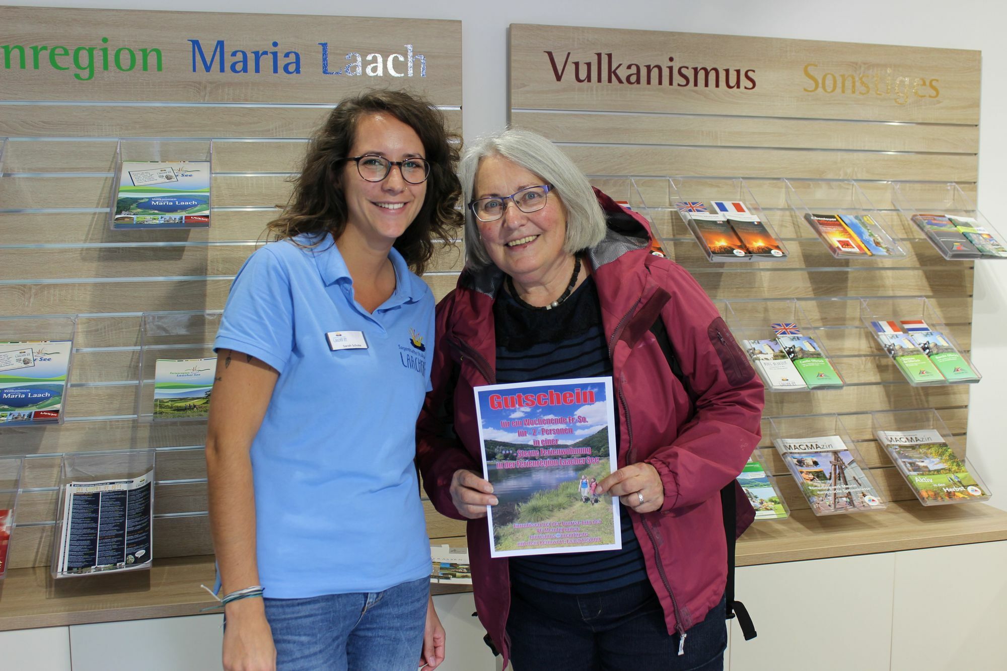 Ellen Bay war schon öfter in der Region unterwegs, jedoch an diesem Tag zum ersten Mal in Maria Laach. "Die Wanderlust hat mich zu einem zweiwöchigen Urlaub in die Eifel gebracht", gab sie lächelnd preis. Einzelne Eifelsteig-Etappen sowie den von Namedy bis nach Kaisersech verlaufenden Eifel-Camino hat sie während ihrer Urlaubstage bereits erwandert. Zum Abschluss ihrer Ferien führte sie ein Zubringerweg des Eifel Caminos schließlich nach Maria Laach. "Hier kann ich beim Wandern einfach mal abschalten und gleichzeitig noch eine tolle Region mit vielen vulkanischen Elementen erkunden", so die glückliche Gewinnerin. "Die Tourist-Info Maria Laach freut sich über stetig steigende Besucherzahlen. Bis Anfang September konnten bereits mehr als 45.000 Besucher begrüßt werden. Dabei wurde im Monat August mit über 11.000 Besuchern sogar die persönliche Bestmarke geknackt", freuen sich auch die kommunalen Partner des Zweckverbands Vulkanregion Laacher See, die Verbandsgemeinden Brohltal, Pellenz und Mendig. "Die Zahlen belegen, dass Maria Laach und der atemberaubende See ein bekanntes und beliebtes Freizeitziel für Urlauber und Einheimische darstellen. Gemeinseim ermöglichen wir eine gezielte, effektive Vermarktung unserer wunderbaren Vulkanregion, welche eine große Bandbreite potentieller Besucher anspricht", zeigt sich auch der Vorsteher des Zweckverbands, der Mendiger VG-Bürgermeister Jörg Lempertz, überzeugt. Foto: TI Maria Laach www.vulkanregion-laacher-se.de