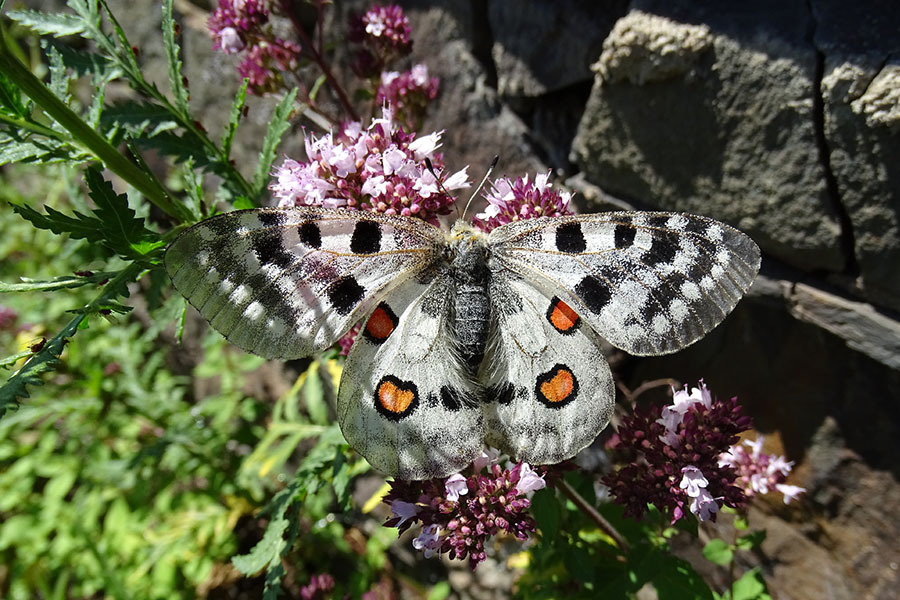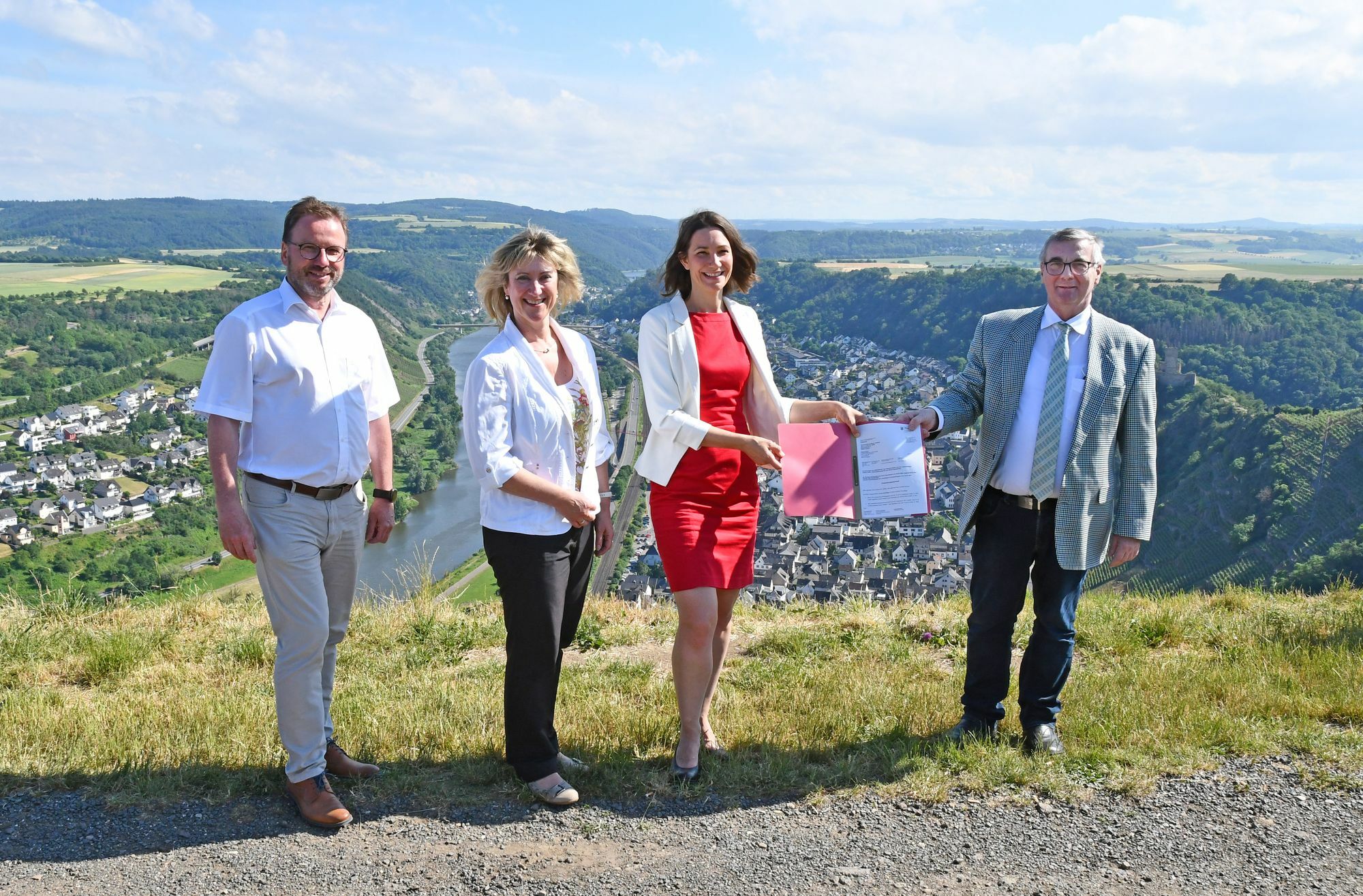 Der Mosel-Apollofalter ist akut vom Aussterben bedroht: In dem eng umgrenzten Verbreitungsgebiet zwischen Winningen und Bremm ist der Bestand des Mosel-Apollos dramatisch von noch knapp 2.000 Exemplaren im Jahr 2015 auf lediglich rund 100 Falter im Sommer 2020 gesunken. Aus diesem Grund setzen sich die Landkreise Mayen-Koblenz und Cochem-Zell gemeinsam mit den örtlichen Kommunen, den Winzern in der Region und mit finanzieller Unterstützung des Landes Rheinland-Pfalz aktiv für den Erhalt des Mosel-Apollos ein. Bei einem Besuch der Projektflächen auf dem Rosenberg oberhalb von Kobern-Gondorf haben Landrat Dr. Alexander Saftig und Anke Beilstein, Erste Beigeordnete des Landkreises Cochem-Zell, jetzt den offiziellen Zuwendungsbescheid in Höhe von rund 160.000 Euro durch die rheinland-pfälzische Umweltministerin Anne Spiegel überreicht bekommen. "Dieses überaus bedeutsame Projekt zur Erhaltung des Apollo-Falters, könnte ohne zusätzliche finanzielle Mittel nahezu unmöglich umgesetzt werden. Ein großer Dank gilt daher dem Land Rheinland-Pfalz, das die Maßnahmen aus der Aktion Grün unterstützt", sagte Landrat Dr. Alexander Saftig. Den Dankesworten schloss sich Anke Beilstein an und zeigte sich zuversichtlich, dass man durch die gemeinsame Zusammenarbeit dem Mosel-Apollo beste Voraussetzungen bieten werde, um wieder vermehrt an der Mosel heimisch zu sein. Umweltministerin Anne Spiegel lobte ausdrücklich das beispielhafte Engagement der beiden Landkreise und aller Beteiligten. "Der Apollofalter ist eine faszinierende Schmetterlingsart, deren Erhalt zum Schutz der Artenvielfalt in Rheinland-Pfalz von besonderer Bedeutung ist. Auch durch den Klimawandel droht der endgültige Verlust dieser Spezies, die hier im unteren Moseltal beheimatet ist. Die Landkreise Cochem-Zell und Mayen-Koblenz haben deshalb ein wichtiges Rettungsprojekt für den Mosel-Apollo gestartet, mit dem sie sich vorbildlich für den Erhalt dieser weltweit einzigartigen Schmetterlingsart engagieren", sagte Spiegel in die Runde, zu der unter anderem auch SGD-Nord-Präsident Wolfgang Treis, SGD-Nord-Vizepräsident Prof. Dr. Martin Kaschny sowie der Bürgermeister der Verbandsgemeinde Rhein-Mosel, Bruno Seibeld, Kobern-Gondorfs Ortsbürgermeister Michael Dötsch und Winzer Martin Dötsch gehörten. Wie es gelingen kann, den Mosel-Apollo zu retten, der zu den streng geschützten Arten gehört und in der "Roten Liste der Schmetterlinge von Rheinland-Pfalz" als vom Aussterben bedrohte Art eingestuft ist, erläuterte der Biotopbetreuer für den Landkreis Mayen-Koblenz, Biologe Jörg Hilgers. Die Maßnahmen lassen grob in die vier Bereiche Datenerhebung, Freistellungsarbeiten, Verbesserung des Nahrungsangebotes und Suche nach Ausweichlebensräumen gliedern. Dort, wo der Mosel-Apollo noch fliegt, führte Hilgers aus, sind im Winterhalbjahr Freistellungsmaßnahmen geplant. Denn das Freistellen der Hänge und Steillagen fördere das Wachstum der Fetthenne – die Futterpflanze der Raupe. Fotos: Axel Schmidt / Kreisverwaltung Mayen-Koblenz www.kvmyk.de