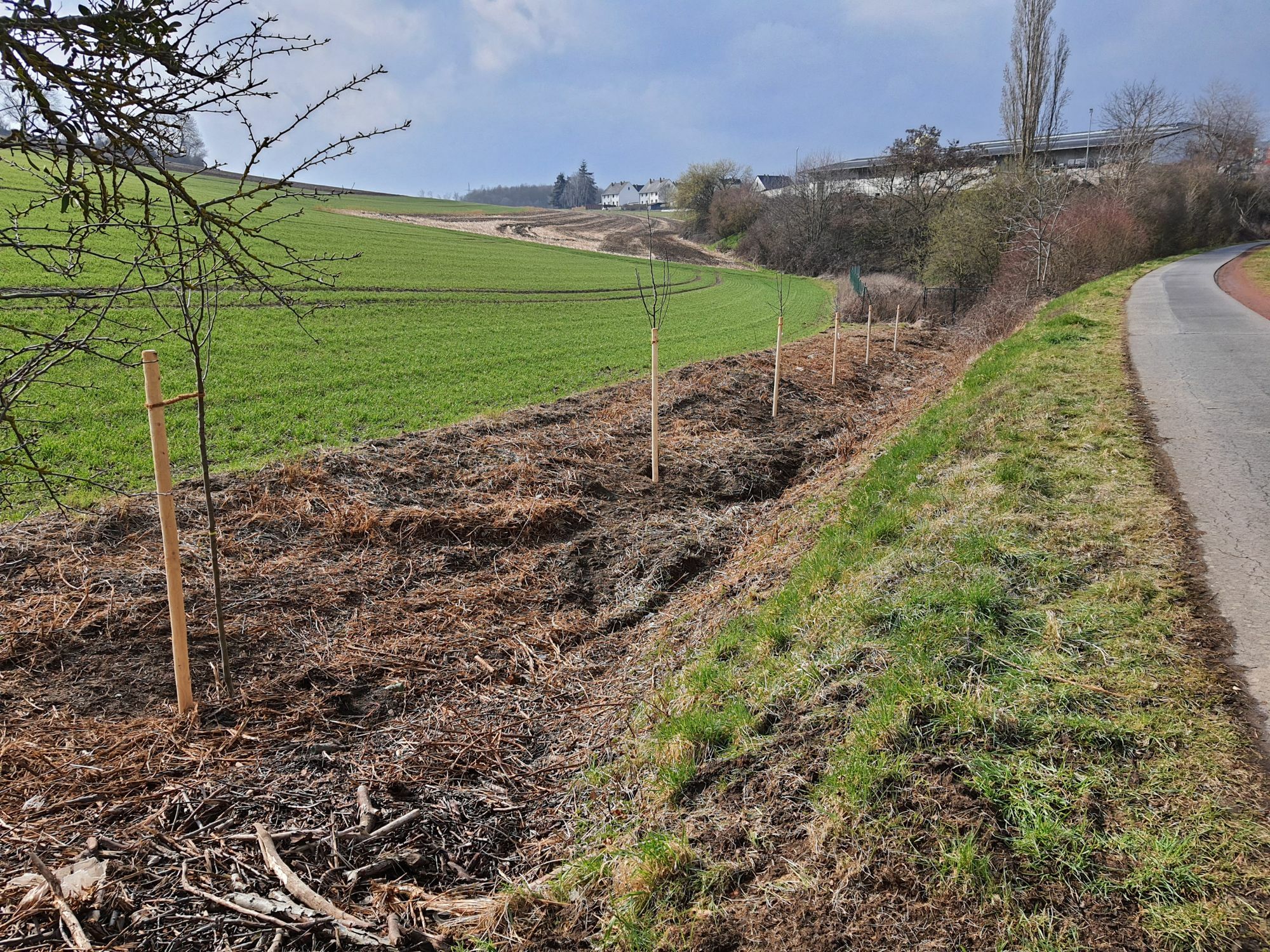 Entlang des Radweges bei Hausen wurden 17 neue Streuobstbäume gepflanzt. Die heimischen Obstsorten, die dort künftig wachsen werden, sollen nicht nur die Radfahrer und Spaziergänger einladen, sich am frischen Obst zu bedienen. Sie sind auch eine wichtige Nahrungsquelle für Vögel, Bienen und sonstige Insekten. Mit den ersten Früchten ist in rund zwei bis drei Jahren zu rechnen. Foto: Stadt Mayen www.mayen.de