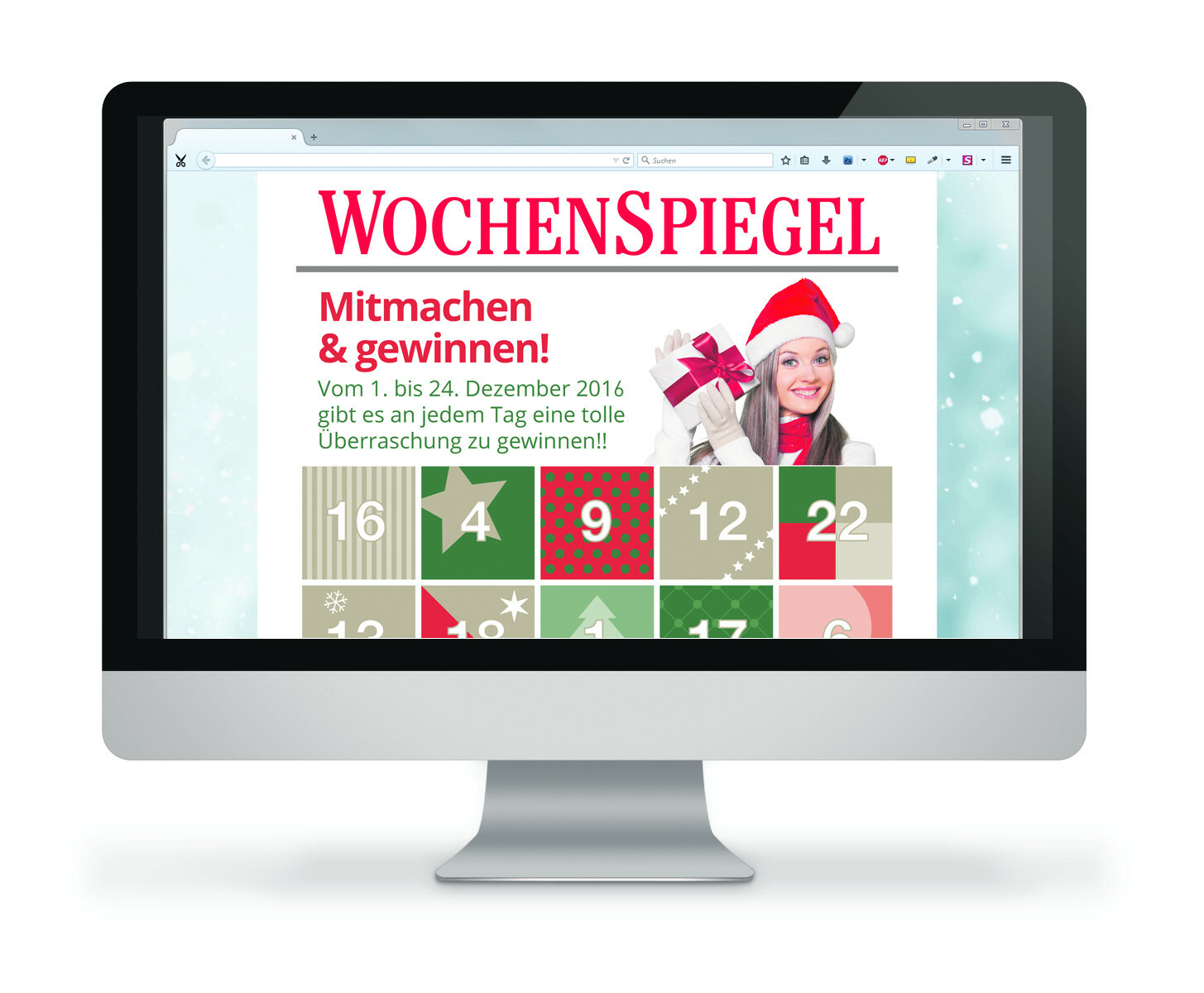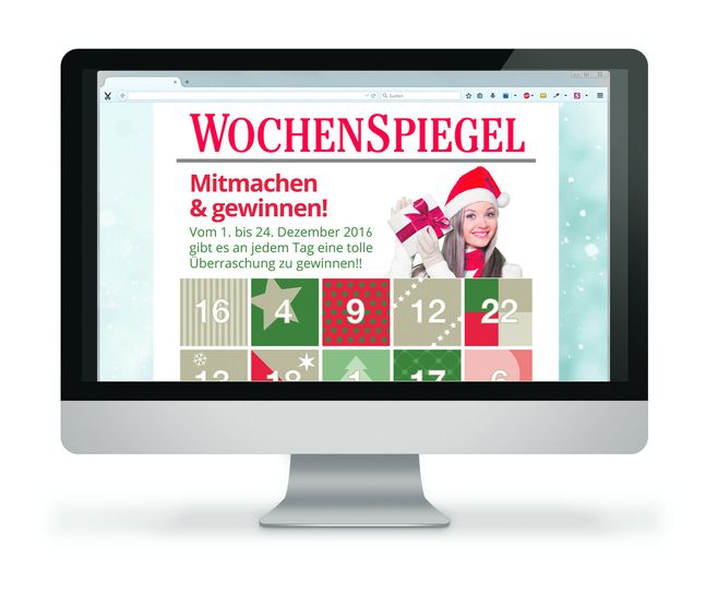 Auch der WochenSpiegel möchte die Leser in diesem Jahr mit einem Adventskalender beglücken. Auf unserer Homepage www.wochenspiegellive.de/adventskalender können Sie jeden Tag ein Türchen öffnen und attraktive Preise gewinnen.Gemeinsam mit den Firmen der Region stellen wir jeden Tag einen Preise zur Verfügung. Am 1. Dezember und an allen Adventssonntagen setzen wir sogar noch einen drauf, denn bei unseren sogenannten Wochenpreisen warten noch höhere Preise.