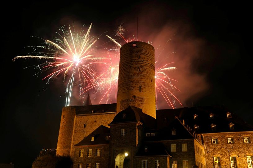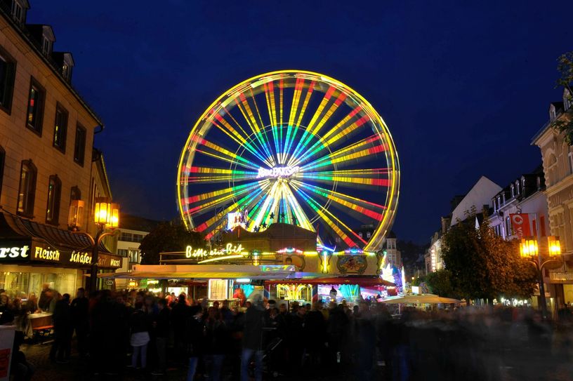 Auch wenn der Lukasmarkt offiziell mit dem Fassanstich am Samstag begann, gab es in diesem Jahr erstmals einen »inoffiziellen Start« - und zwar auf dem Riesenrad »Roue Parisienne«. Der Schausteller-Betrieb Burghard-Kleuser präsentiert das Fahrgeschäft alle zwei Jahre im Wechsel auf dem Marktplatz. Bereits am Donnerstag und Freitags fanden vier Weinproben mit dem Weingut Weckbecker und mit Catering von »Gourmet Wagner« auf dem Riesenrad statt, wobei alle Termine ausverkauft waren. Radweltmeister Rudi Altig war Ehrengast bei der Eröffnungsweinprobe. Ebenfalls am Freitagabend beim Schaustellerempfang konnte Oberbürgermeister Wolfgang Treis langjährige Teilnehmer des Lukasmarktes auszeichnen (siehe Innenteil). In diesem Jahr wurden am ersten Wochenende 90.000 große und kleine Besucher gezählt mit einem erfolgreichen verkaufsoffenen Sonntag. Dann schlug das kühlere und regnerische Herbstwetter zu. War es beim Pferdemarkt am Dienstag »nur« kalt, verregnete es Händlern den Schafmarkt und den zweiten Tag des Krammarktes. Drei Regentage in der Wochenmitte, die die Schausteller wenig jubeln ließen; trotzdem: »Circa 270.000 Besucherinnen und Besucher kamen an allen neun Tagen«, berichtet Marktmeister Horst Krämer, der sein »Silbernes Lukasmarkt-Jubiläum« feiern konnte. Auch zum 610. Lukasmarkt konnten wieder Neuheiten und Bewährtes platziert werden. Dazwischen wechselten sich Imbiss und Getränkestände sowie Süßwaren und Ausspielungen ab. Wie schön ein Lukasmarkt-Besuch sein kann, erfuhren in diesem Jahr mehr als 30 Kinder aus Flüchtlings- und bedürftigen Familien. In Zusammenarbeit mit der »Mayener Tafel« wurden die Jungen und Mädchen von zwei Schaustellern eingeladen, einen unbeschwerten Nachmittag mit Karussell-Fahren, Essen und Getränken zu genießen. Die Eltern, die ihre Kinder so glücklich sahen, konnten dabei die ein oder andere Träne nicht aufhalten. Ein Bodenfeuerwerk, abgeschossen vom Doppel-Weltmeister Firma Steffes-Ollig, Müllenbach am letzten Sonntag zog dann Besucherströme in die Innenstadt und ließ die Regenstunden Anfang der Woche fast vergessen. »Wir sind insgesamt sehr zufrieden«, lautet das Fazit von Oberbürgermeister Wolfgang Treis. »Aber nach dem Lukasmarkt ist vor dem Lukasmarkt. Die ersten Planungen laufen bereits und Mitte Dezember wird der Marktausschuss schon über die Attraktionen für 2016 zu beraten haben«, verrät der Stadtchef. www.lukasmarkt.de Fotos: Seydel