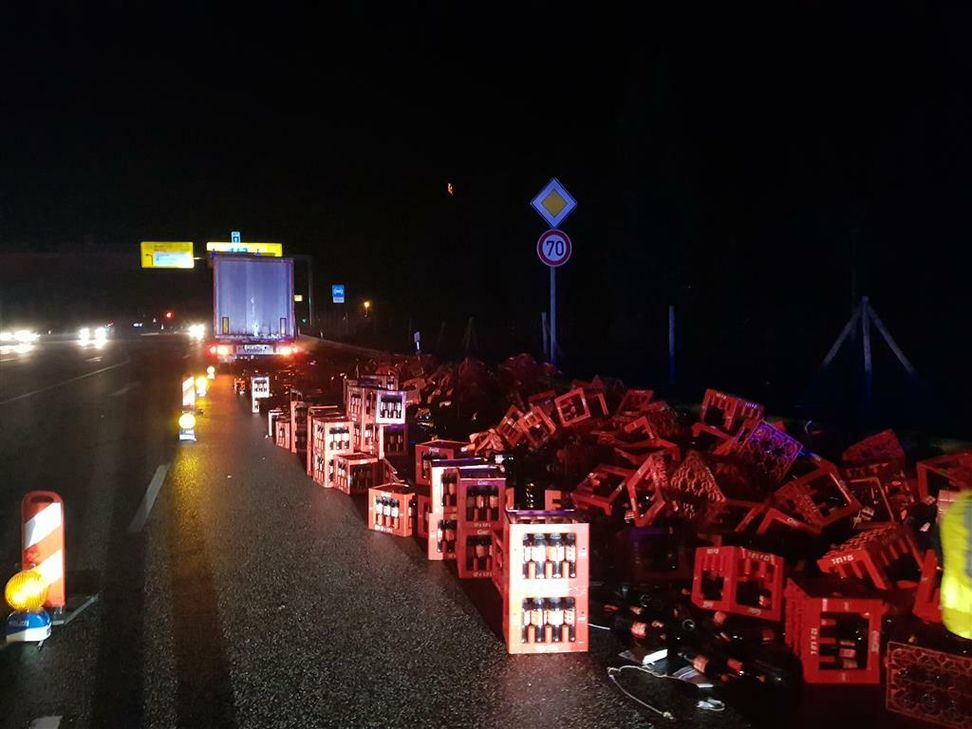 Am Montagmorgen, 2. Dezember, gegen 5.15 Uhr, hat ein mit 1.200 Cola-Kisten beladener Sattelzug beim Abbiegen von der A 61 auf die B 262 bei Mendig einen großen Teil seiner Ladung verloren.