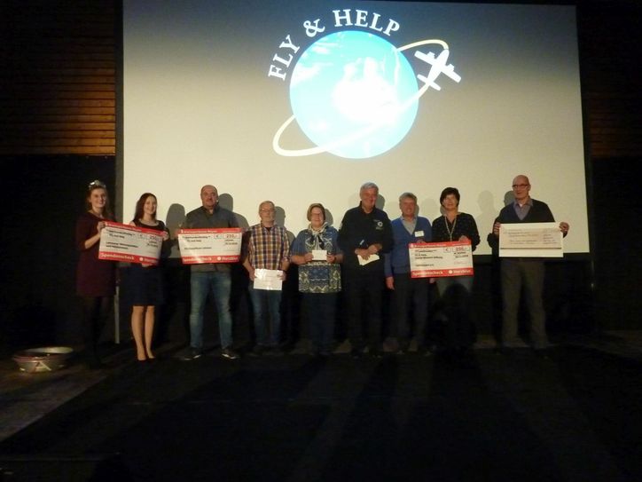 In Lehmen konnten Schecks in Höhe von 5.885 Eur überreicht werden. Die Spendengelder kamen auch von den Weinmajestäten Nina und Katharina sowie den Razejungen, vom Kirchenchor Lehmen, dem TSV Lehmen und von der Regionalen Schule Untermosel. Einen Scheck in Höhe von 1.500 Euro überreichte Christian Müller aus Brachtendorf, der das Geld von einem Benefiz-Vortrag über die Namibia-Reise mit seinem Motorrad spendete. Mit lang anhaltenden, stehenden Ovationen bedankten sich die Besucher in Lehmen für die dreistündige Live-Show mit farbenprächtigen Bildern, kurzweiligen Videos sowie für die fantastischen Darbietungen der Künstler. Nach den Veranstaltungen beantwortete Reiner Meutsch noch viele Fragen zu seiner Weltumrundung und zur Stiftung "Fly & Help". In diesem Jahr hat Meutsch bereits 84 Schulen in Entwicklungsländern eröffnen können. Foto: privat www.fly-and-help.de www.lehmensart.de www.roehrig-bauzentrum.de
