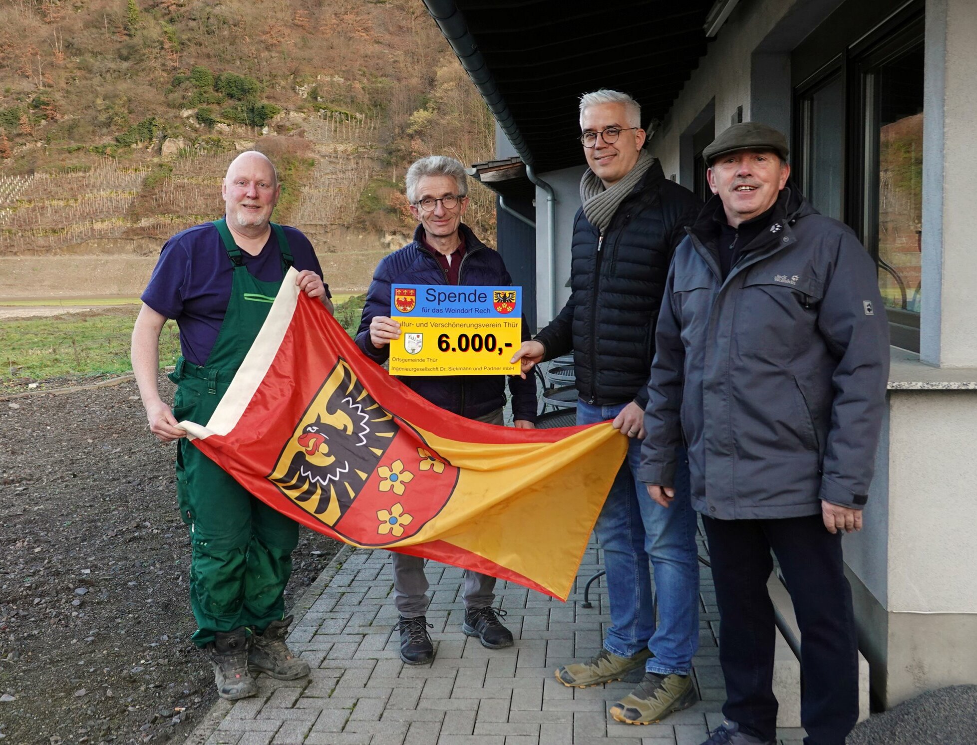 Die »Renner« der kulinarischen Feier waren die Kartoffelsuppe von Ruth Schäfer-Berresheim, das Grillgut des Ortsbürgermeisters, die zahlreichen Kuchenspenden der Thürer Frauen und der Flutwein aus dem Ahrtal. Das Spendenergebnis war überwältigend. Jetzt konnte der Vorsitzende des KVV, Johannes Schneider, 6.000 Euro an den Ortsbürgermeister von Rech, Dominik Gieler, überreichen. Thürs Ortsbürgermeister Rainer Hilger ließ es sich nicht nehmen, bei der Spendenübergabe in Rech persönlich dabei zu sein und dabei auch Achim Sebastian zu danken, der die Verbindung zur gemeinde Rech vermittelt hatte.