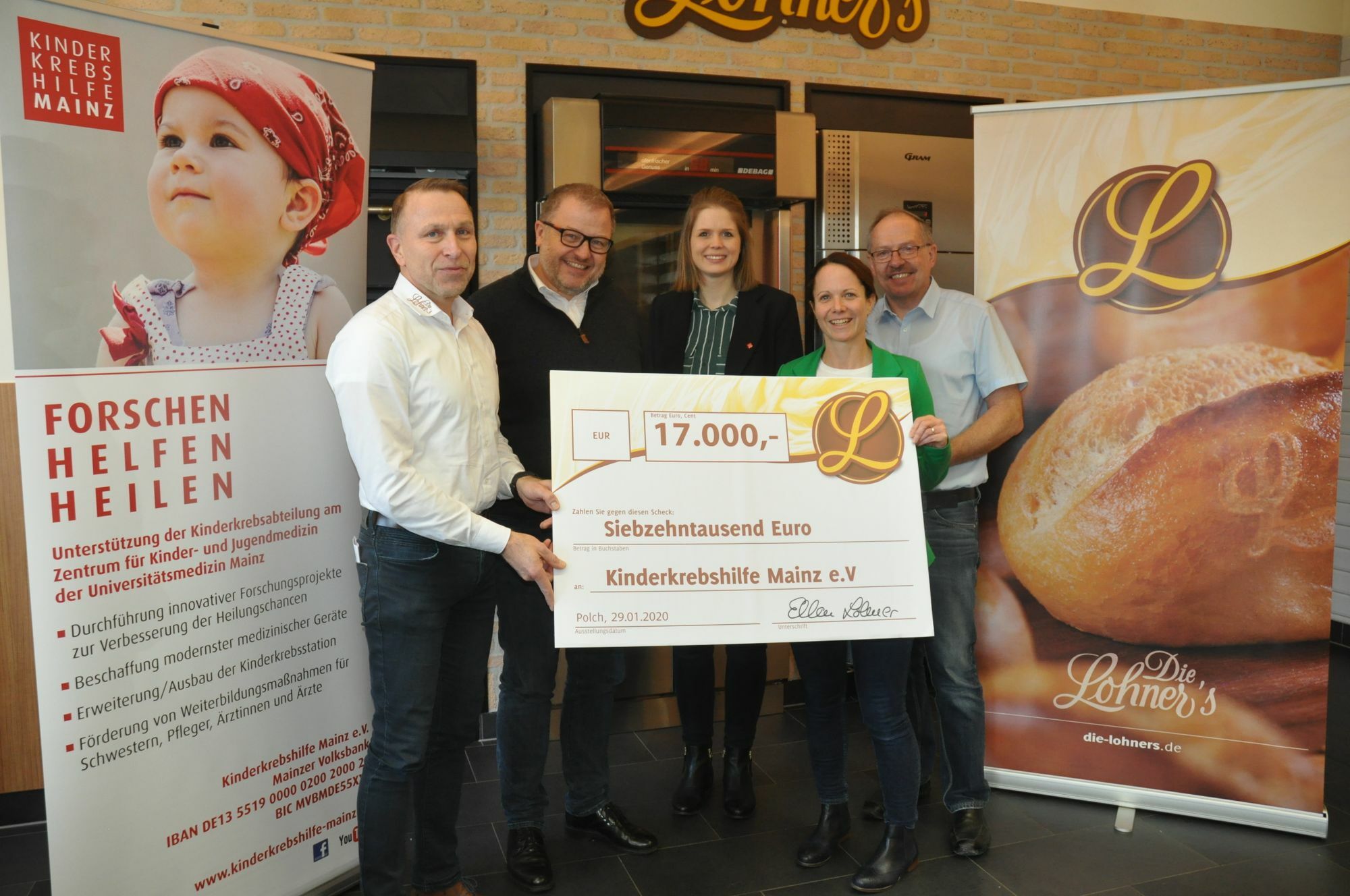 In jedem Jahr – wenn der Advent naht – bringen "Die Lohner's" ein besonderes Kaffeeteilchen auf den Markt: den "Spendentaler" – ein Rührteiggebäck überzogen mit Schokoladen-Kuvertüre. Beim Verkauf des "Talers gehen von 1,20 Euro Verkaufspreis jeweils 20 Cent an eine jährlich wechselnde, gemeinnützige Organisation. Von der jüngsten Aktion profitierte die Kinderkrebshilfe Mainz. In den mittlerweile mehr als 150 Filialen der Polcher Bäckerei in Rheinland-Pfalz, Hessen und Nordrhein-Westfalen wurden in den sechs Wochen vor Weihnachten 85.000 "Spendentaler" verkauft, die in der Summe einen Spendenerlös von 17.000 Euro erbrachten. "Das ist die höchste Spendensumme, die wir mit dieser Aktion bisher erlösen konnten. Und das lag auch an unserem Partner, den Männern und Frauen der Kinderkrebshilfe Mainz, die sich mit großem Engagement eingebracht haben", freute sich "Lohner's"-Geschäftsführer Helmut Moll. Das Kompliment gab Eric Schierholz, Vorstandsmitglied der Kinderkrebshilfe Mainz gerne zurück: "Wir sind ja selbst in den Filialen rund um Mainz aktiv gewesen und die Mitarbeiterinnen haben uns sehr unterstützt. Uns ist überall große Herzlichkeit entgegengebracht worden." Die Kinderkrebshilfe Mainz ist eine gemeinnützige Organisation, die 2009 von Kinderärztinnen und -ärzten des Zentrums für Kinder- und Jugendmedizin der Universitätsmedizin Mainz gegründet wurde. Ziel ist die Behandlung krebskranker Kinder zu sichern und ihre Heilungschancen zu verbessern, um damit den Krebs gemeinsam besiegen. Unter anderem werden zusätzliche medizinische Fachkräfte und deren Weiterbildung finanziert sowie medizinische Geräte angeschafft. Foto: Pauly www.die-lohners.de www.kinderkrebshilfe-mainz.de