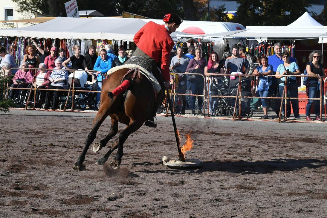 Der Einlass auf das Gelände beginnt um 8 Uhr. Das Schau- und Informationsprogramm startet um 10 Uhr und endet circa um 15.30 Uhr. Der Eintrittspreis beträgt sechs Euro, Kinder bis 1,40 m Größe und Schulklassen haben freien Eintritt. Die Veranstaltung findet auf dem Viehmarktplatz, Polcher Straße, statt. Eine P+R-Möglichkeit vom Industriegebiet zum Viehmarktplatz ist ab 8 Uhr eingerichtet. Programm: 10 Uhr: Grüße von der iberischen Halbinsel/Ausbildung an der Garrocha Nachmachen erwünscht/Trail mit Pferd und Hund Zwei Kleine ganz groß/Geschicklichkeitsdemo mit Shettygespann - Rasante Maschinen/ Kaltblutparcours mit Ackergeräten. Der Apfel fällt nicht weit vom Stamm/Teens mit Tuch. 11 Uhr: Wie war das mit den Schecken und den G..../Free-line Demo Wie die Alten sungen, so zwitschern die Jungen/Barocke Reitweise Schwierige Pferde muss man verstehen damit sie gehe /Ausbildung. Jetzt wird es feurig/Iberische Impressionen mit Feuergarrocha Schafe auf dem Pferdemarkt? Pause bis bis 13.15 Uhr. 13.15 Uhr: Grüße von der iberischen Halbinsel/Ausbildung mit der Garrocha Nachmachen erwünscht/Trail mit Pferd und Hund Zwei Kleine ganz groß / Geschicklichkeitsdemo mit Shettygespann - Rasante Maschinen/Kaltblutparcours mit Ackergeräten Der Apfel fällt nicht weit vom Stamm/Teens mit Tuch 14.15 Wie war das mit den Schecken und den G..../ Free-line Demo Wie die Alten sungen, so zwitschern die Jungen/Barocke Reitweise Schwierige Pferde muss man verstehen damit sie gehen/Ausbildung. Jetzt wird es feurig/Iberische Impressionen mit Feuergarrocha. Finale mit allen Akteuren (Änderungen vorbehalten). Fotos: Walz