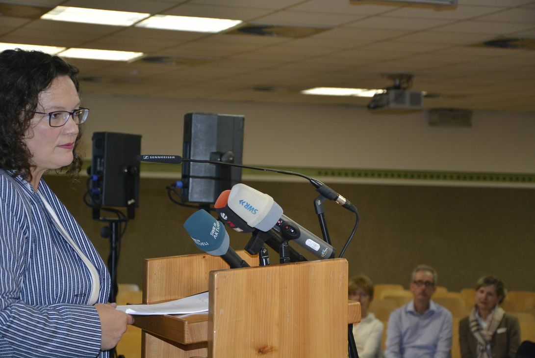 Mit einem Besuch der Ausstellung "Asche oder Feuer", die ab Samstag, 17. August, in der alten Schreinerei gezeigt wird, stimmte sich die ehemalige SPD-Parteivorsitzende Andrea Nahles, die eine enge Beziehung zu Maria Laach hat, auf ihren Vortrag ein. Thema: Die Gleichberechtigung von Mann und Frau laut Grundgesetz und im wahren Leben. Aus Anlass von 70 Jahren Grundgesetz der Bundesrepublik Deutschland und 70 Jahre nach Adenauers Wahl zum ersten Bundeskanzler findet die Ausstellung "Glaube und Politik. Konrad Adenauer und die Abtei Maria Laach." statt (noch bis zum 13. Oktober im Klosterforum). Passend dazu, direkt im daneben liegenden Saal, wurde Andrea Nahles zu ihrem Vortrag von Laacher Forums-Besuchern ebenso wie von Pressevertretern erwartet. In ihrem 30-minütigen Referat ging sie auf die drei Säulen ein, die die Demokratie braucht: ein starkes Symbol (schwarz-rot-goldene Flagge), ein Fundament (das Grundgesetz mit einer klaren Sprache) und Menschen, die aktiv dafür einstehen. "Das Grundgesetz ist ein Bollwerk gegen Feinde der Demokratie", so Nahles. Zu Frauen in der Politik sagte sie: "Wir haben viel erreicht". Zu ihrer eigenen Zukunft im Bundestag hielt sie sich zurück. Es werde sich in absehbarer Zukunft zeigen. "Man muss wissen, wann man etwas Neues anfangen muss." In Maria Laach war dies vielleicht ein Anfang. Fotos: Kruft