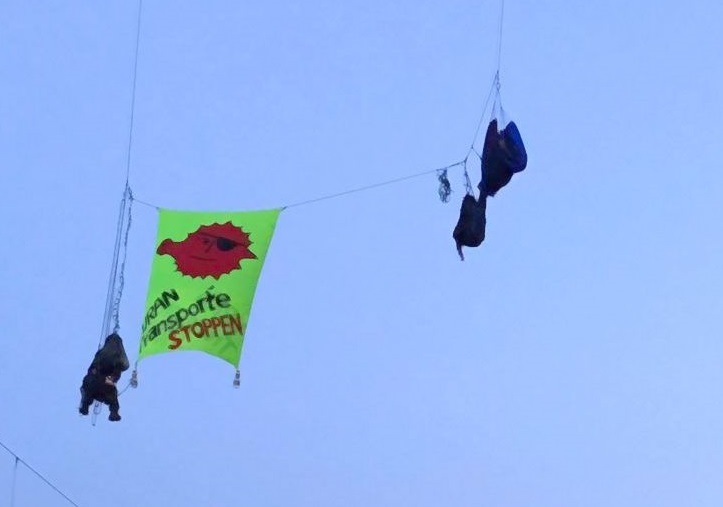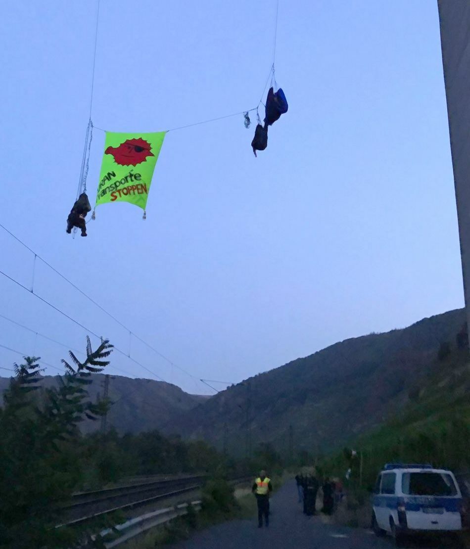 An der Protestaktion beteiligten sich neun Personen. Davon hielten sich sieben unmittelbar im Gleisbereich auf und zwei Personen seilten sich von der über der Bahnstrecke befindlichen Autobahnbrücke der A61 ab. Die Beiden hingen in circa 20 Meter Höhe und entfalteten ein Protestbanner. Der betroffene Güterzug war kein Atomtransport. Die Bahnstrecke wurde, so die Bundespolizei, unverzüglich gesperrt und die Abschaltung der 14.000 Volt führenden Oberleitung veranlasst. Die Personen am Boden wurde durch die Bundespolizei vorübergehend in Gewahrsam genommen. Für die in der Luft befindlichen Aktivisten rückte das Team der Höhenrettung aus Boppard an. Dieses brachte die Atomkraftgegner wohlbehalten zu Boden. Nach Aufnahme der Personalien wurden alle Personen aus dem Polizeigewahrsam entlassen. Ein tatsächlich über die betroffene Strecke verlaufender Urantransport befand sich zum Zeitpunkt der Protestaktion im Güterbahnhof Koblenz. Die Bahnstrecke war von 5.40 bis 9.34 Uhr gesperrt. Im Einsatz waren die Bundespolizei, die Autobahnpolizei Emmelshausen, die Freiwilligen Feuerwehren Boppard und Winningen und der Notfallmanager der Bahn. Es wurde neben diversen Ordnungswidrigkeiten ein Strafverfahren wergen Störung öffentliche Betriebe eingeleitet. Foto: Bundespolizei