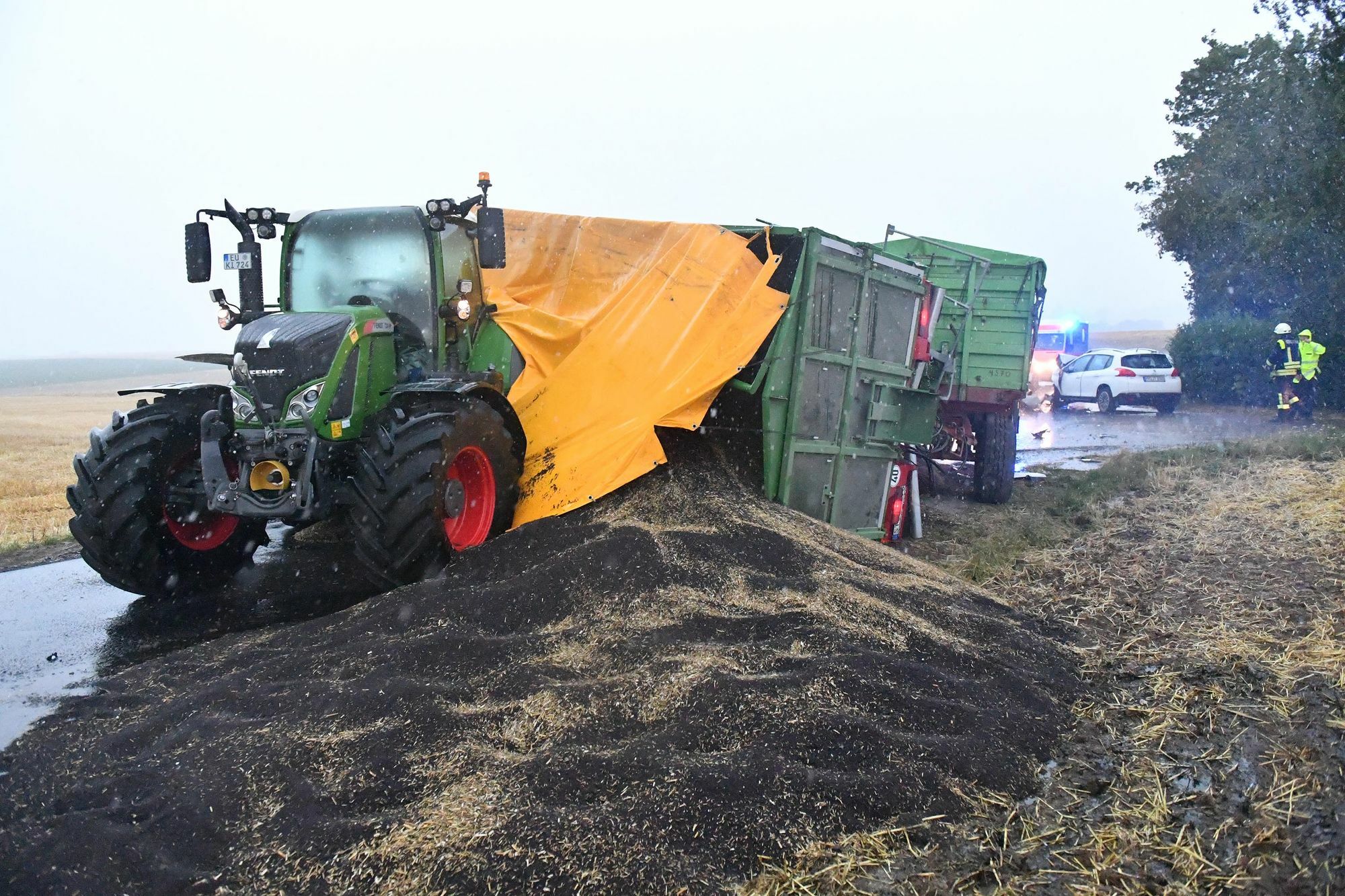 Nach der Kollision kippte ein Anhänger des Traktors um und mehrere Tonnen Raps verteilten sich auf der Straße.  Die Rettungsmaßnahmen sowie die Säuberung der Fahrbahn wurden durch ein Gewitter mit Starkregen erschwert. Die Freiwillige Feuerwehr Mayen und die Straßenmeisterei waren rund zwei Stunden im Einsatz. Foto: Walz