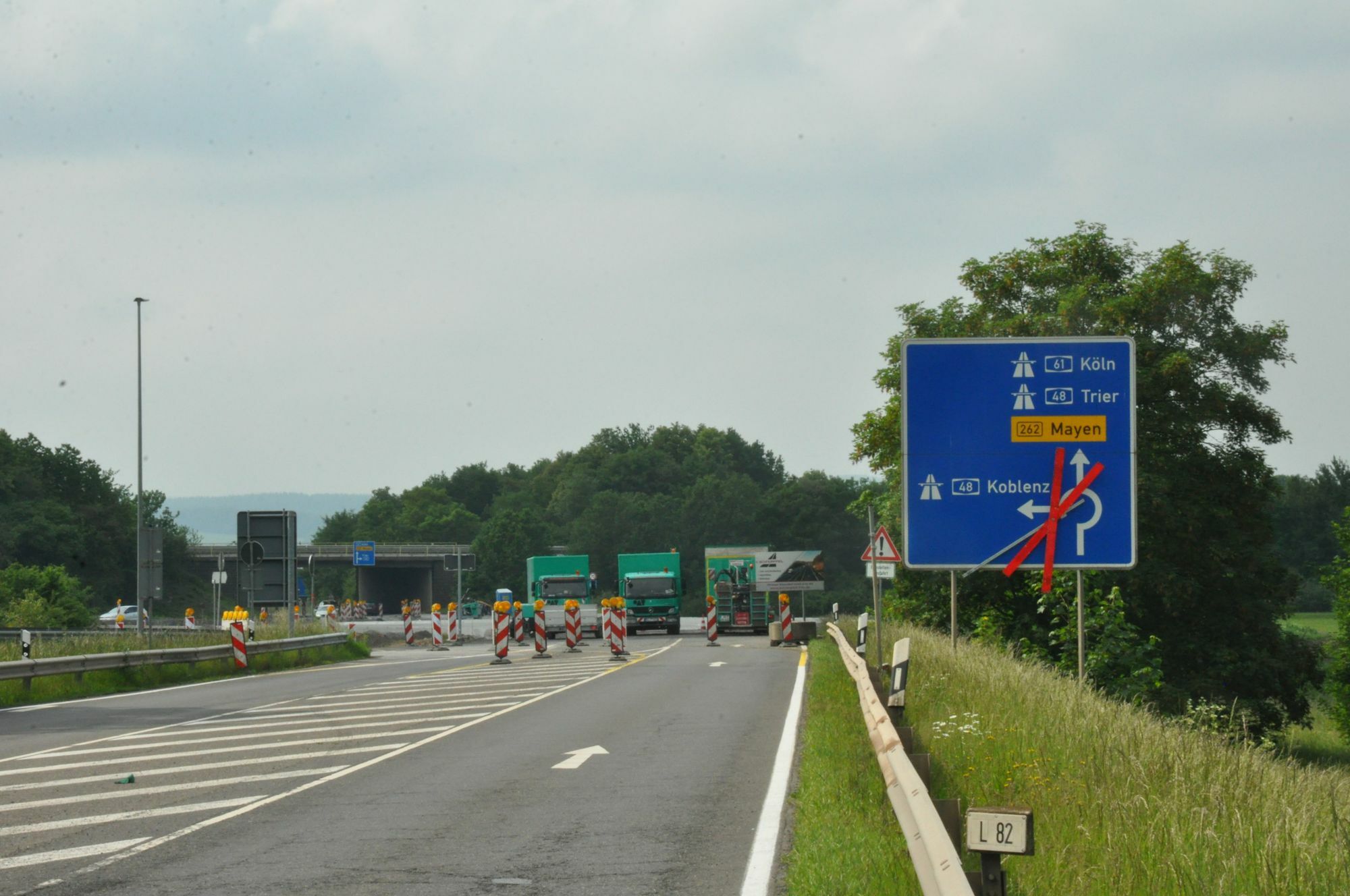Ab Montag, 28. Mai, wird der Bereich der B 262 zwischen dem Kreisel und der Abfahrt der A 48 in Richtung Mayen saniert. Für die Dauer von etwa zwei Wochen steht auf der B 262 dann nur eine Fahrtrichtung zur Verfügung. Von Mayen auf die Autobahn A 48 und auch ins Maifeld kann wie gewohnt gefahren werden. Vom Kreisel in Richtung Mayen steht keine Fahrspur zur Verfügung. Die Abfahrt der A 48, von Trier kommend, wird deshalb für die Fahrziele Mayen und Mendig gesperrt und die Verkehrsteilnehmer werden über die Anschlussstelle Polch umgeleitet beziehungsweise über das Koblenzer Kreuz weitergeführt.Die Verkehre von der L 82 und L 52 aus Polch, mit dem Fahrziel Mayen, werden über Mayen-Alzheim umgeleitet. Nachdem die Asphaltarbeiten auf der B 262 und die Fugen- und Angleichungsarbeiten im Bereich des Kreisels abgeschlossen sind, wird der Verkehr auf den neuen Kreisel umgelegt und auch die B 262 wieder in beide Richtungen freigegeben. Im Zuge der weiteren Sanierungen werden die Auf- und Abfahrten der Autobahn kurzzeitig gesperrt beziehungsweise eingeengt werden; daher bittet der Landesbetrieb Mobilität (LBM) die Verkehrsteilnehmer um erhöhte Aufmerksamkeit. Foto: Pauly www.lbm.rlp.de
